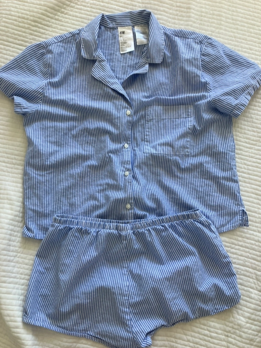 Women's pajama set. Blue and white striped cotton. Short sleeve top and shorts. Button down top.