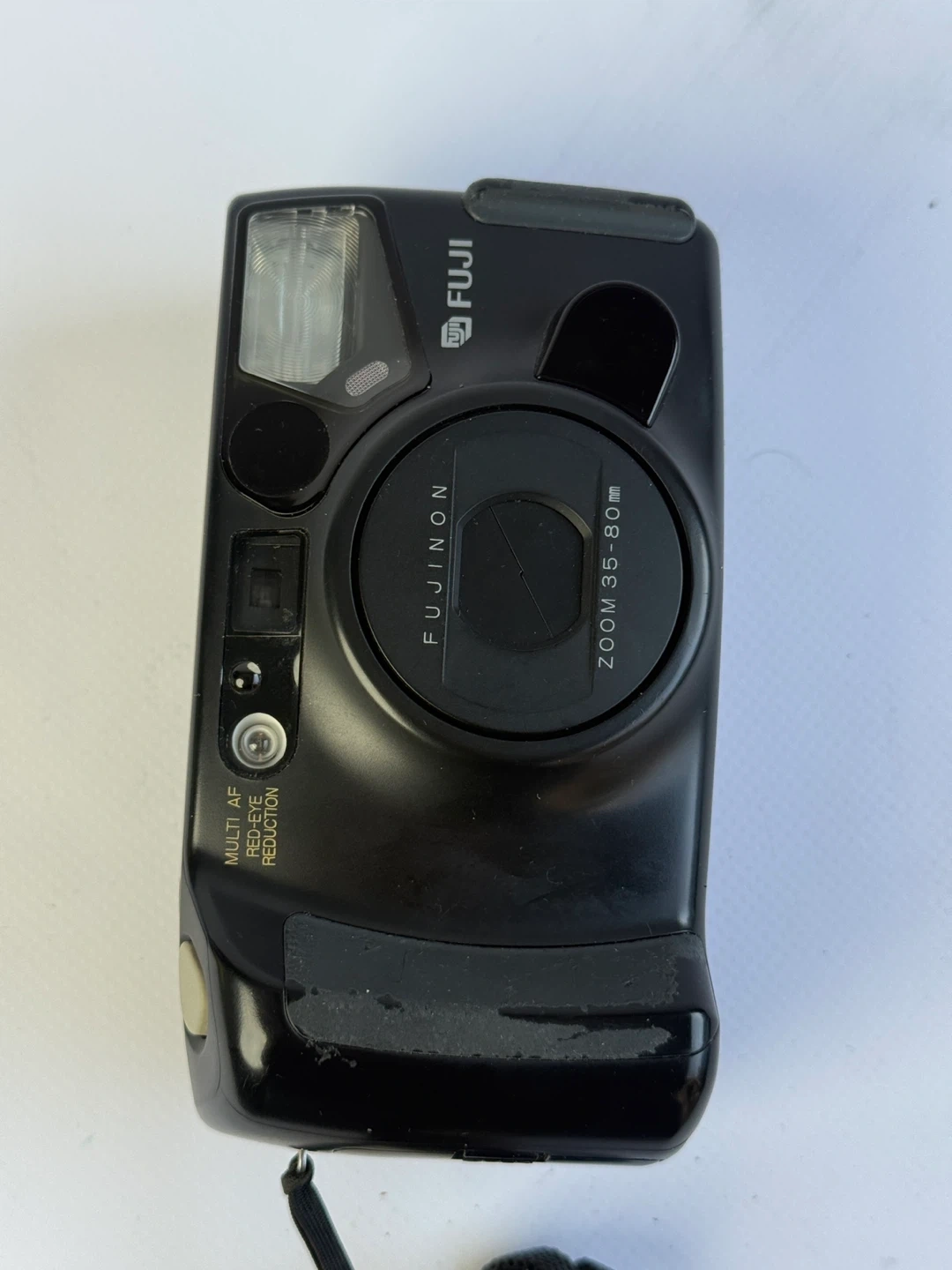 This Fujifilm point-and-shoot camera has a 35-80mm zoom lens and multi-AF with red-eye reduction. It also features drop-in loading and pre-winding for film. Perfect for capturing memories on the go!