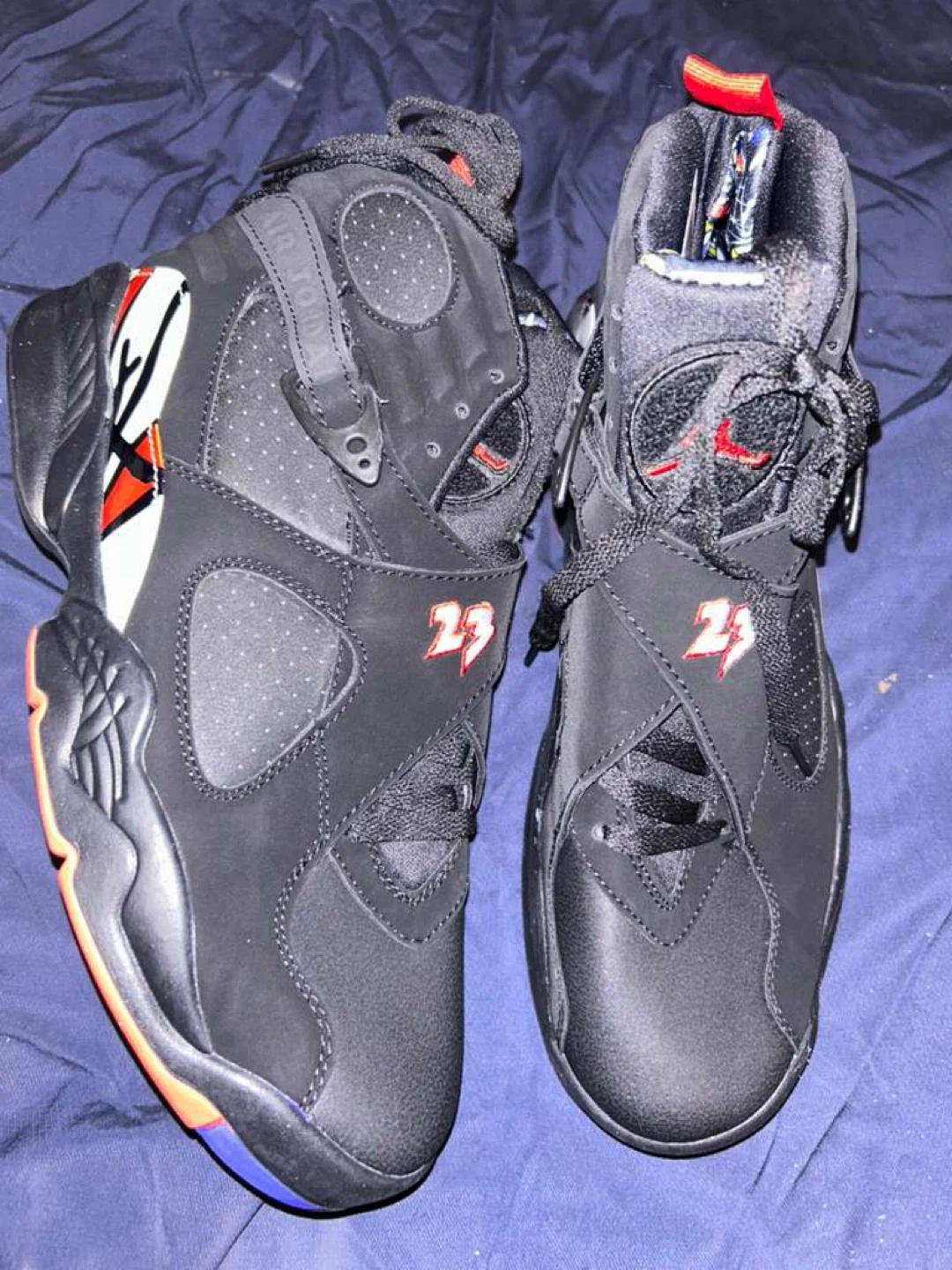 Classic Air Jordan 8 Retro "Playoff" sneakers. Black, red, and orange colorway. Features the iconic "23" on the straps. This pair includes the original box.