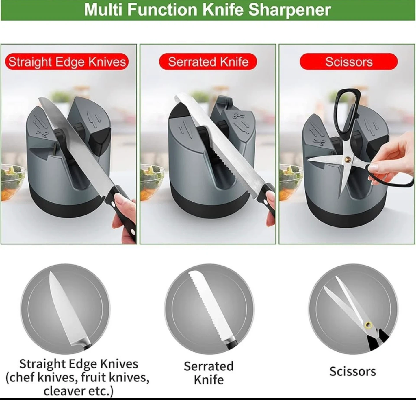 I'm selling a multi-function knife sharpener! It's designed to sharpen straight edge knives, serrated knives, and even scissors. It comes with the original box!