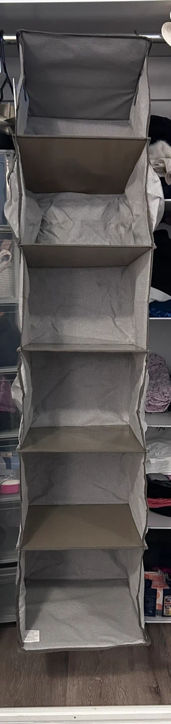 Keep your closet tidy with this hanging organizer! It features six shelves to maximize vertical space. Perfect for storing clothes, shoes, or accessories and keeping them easily accessible. It also has 4 side pockets.