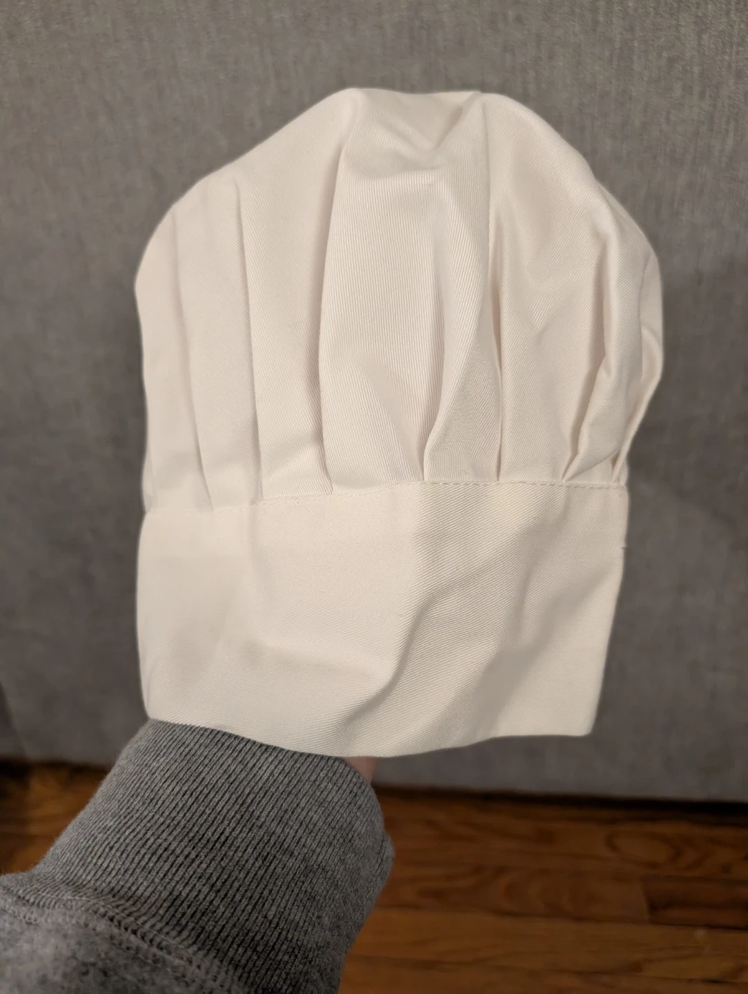Here's a clean, white chef's hat! It's in great condition and ready for your culinary adventures or costume needs. A simple and classic design for any aspiring chef or baker