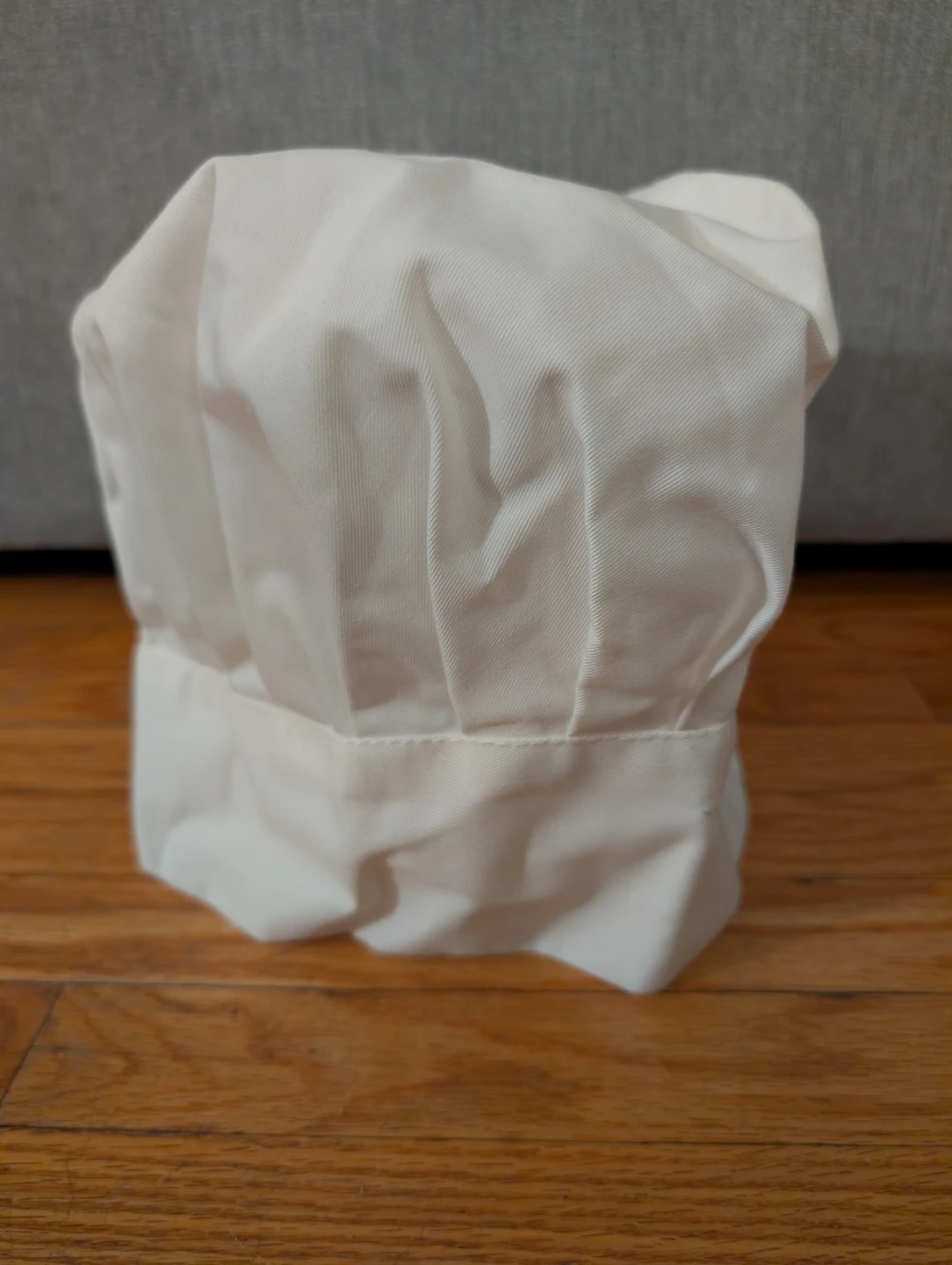 Here's a clean, white chef's hat! It's in great condition and ready for your culinary adventures or costume needs. A simple and classic design for any aspiring chef or baker