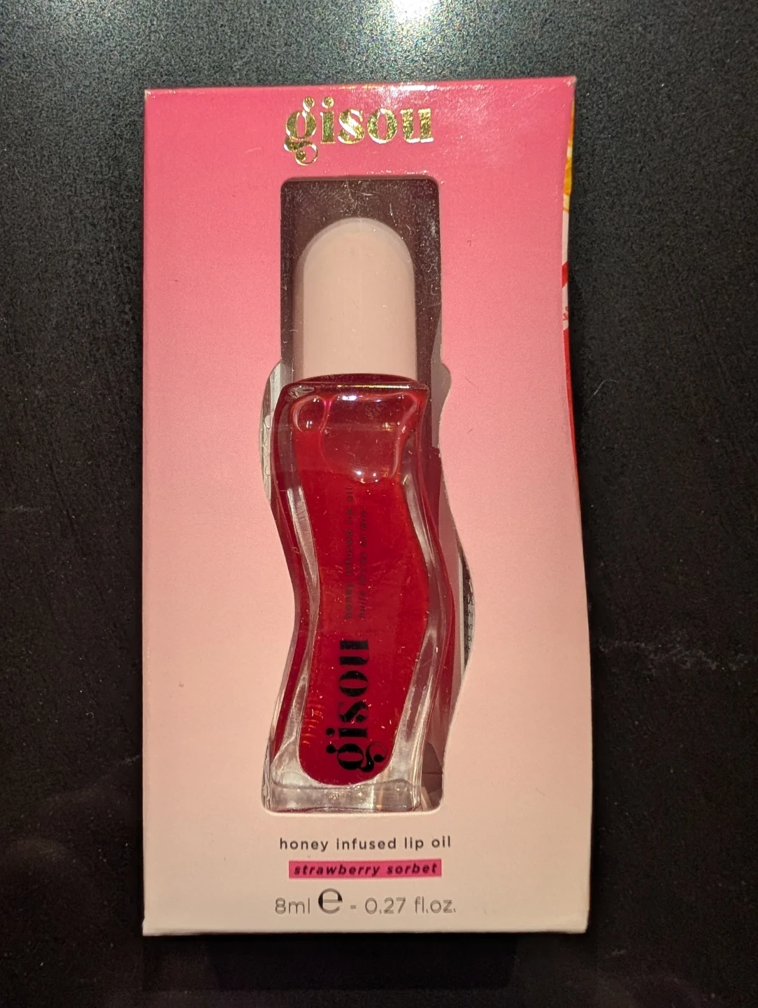 Gisou Honey Infused Lip Oil in the 'Strawberry Sorbet' flavour. It's 8ml and made with Mirsalehi Honey and Bee Garden Oils. This lip oil deeply hydrates and adds shine!