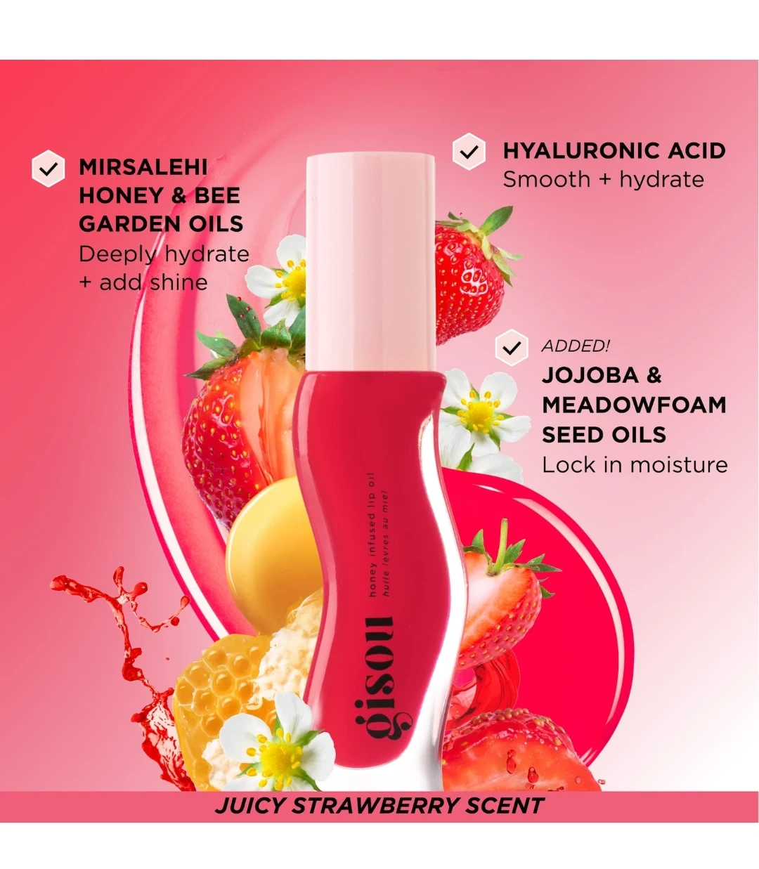 Gisou Honey Infused Lip Oil in the 'Strawberry Sorbet' flavour. It's 8ml and made with Mirsalehi Honey and Bee Garden Oils. This lip oil deeply hydrates and adds shine!