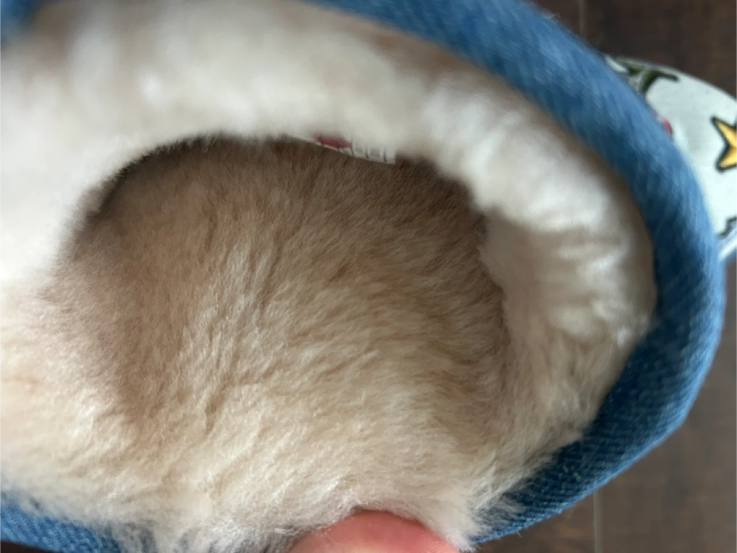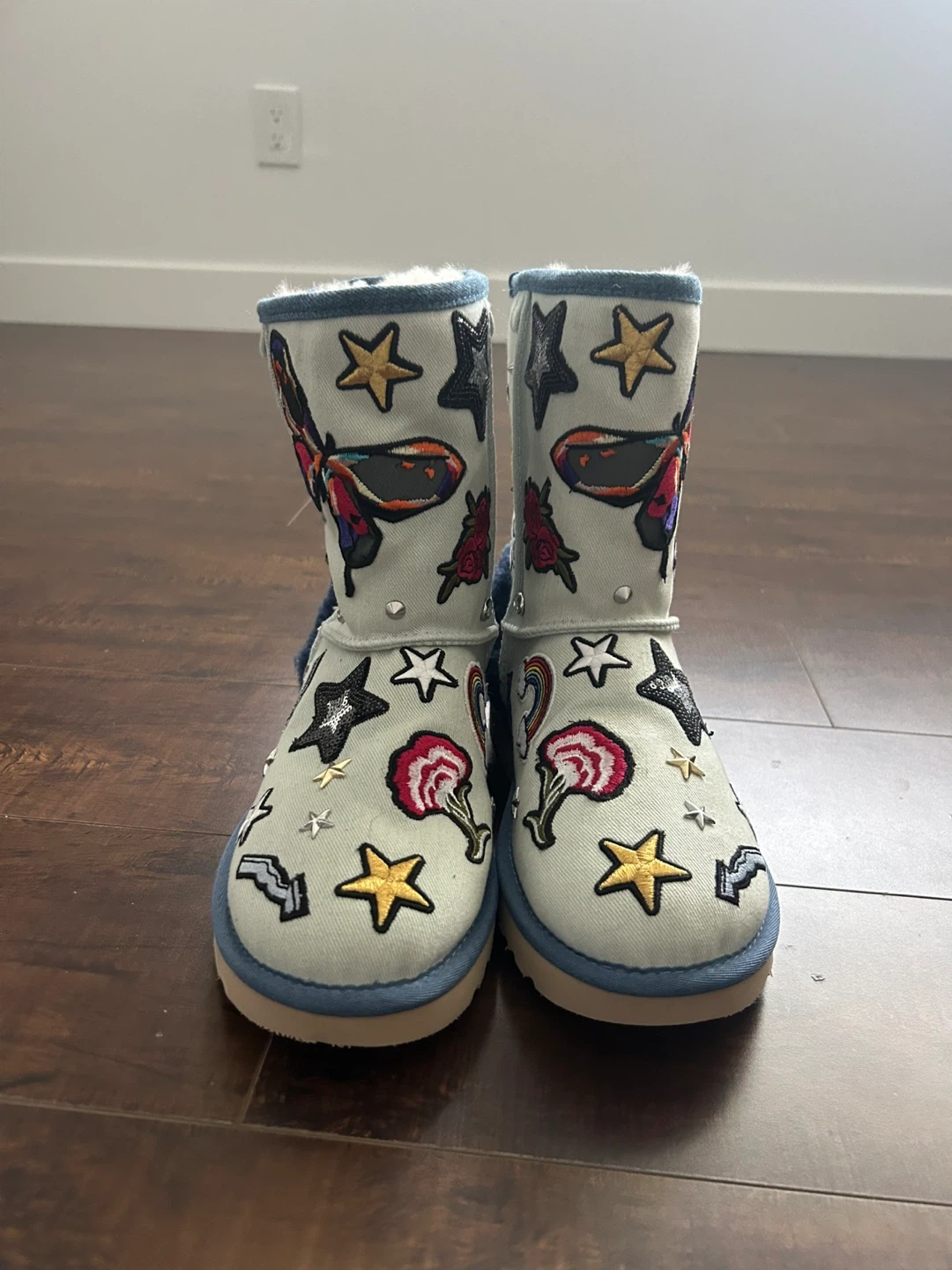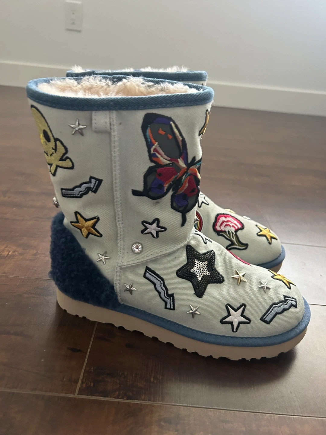 These BRAND NEW UGG boots are a light blue denim-like material and feature various patches like butterflies, skulls, stars, and mushrooms. They have a cozy, fluffy interior lining and a blue faux fur trim around the top. Great for adding some fun to your winter footwear!