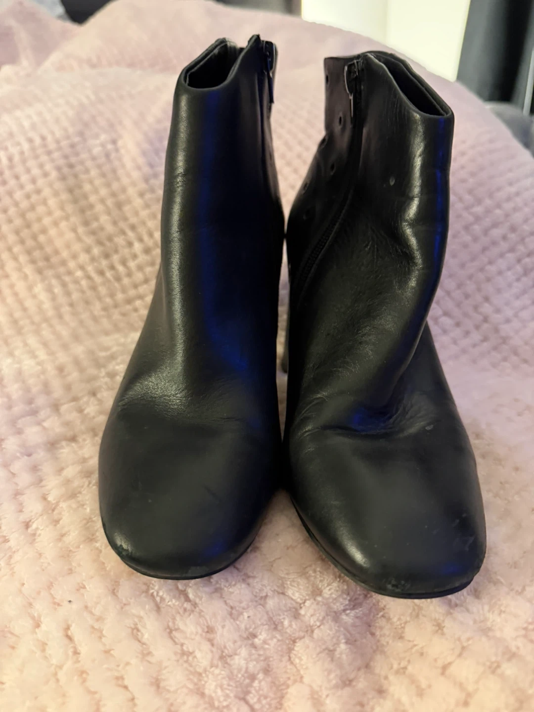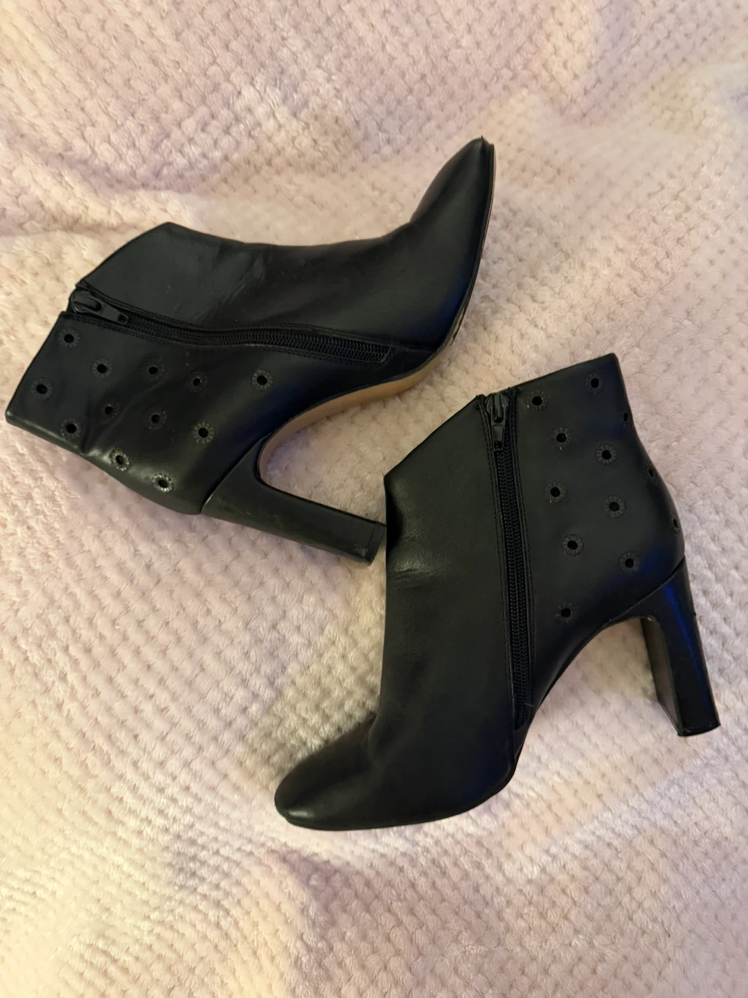Chic black leather ankle boots featuring a stylish perforated design. These boots have a side zipper closure and a comfortable block heel. Perfect for adding a touch of flair to any outfit!