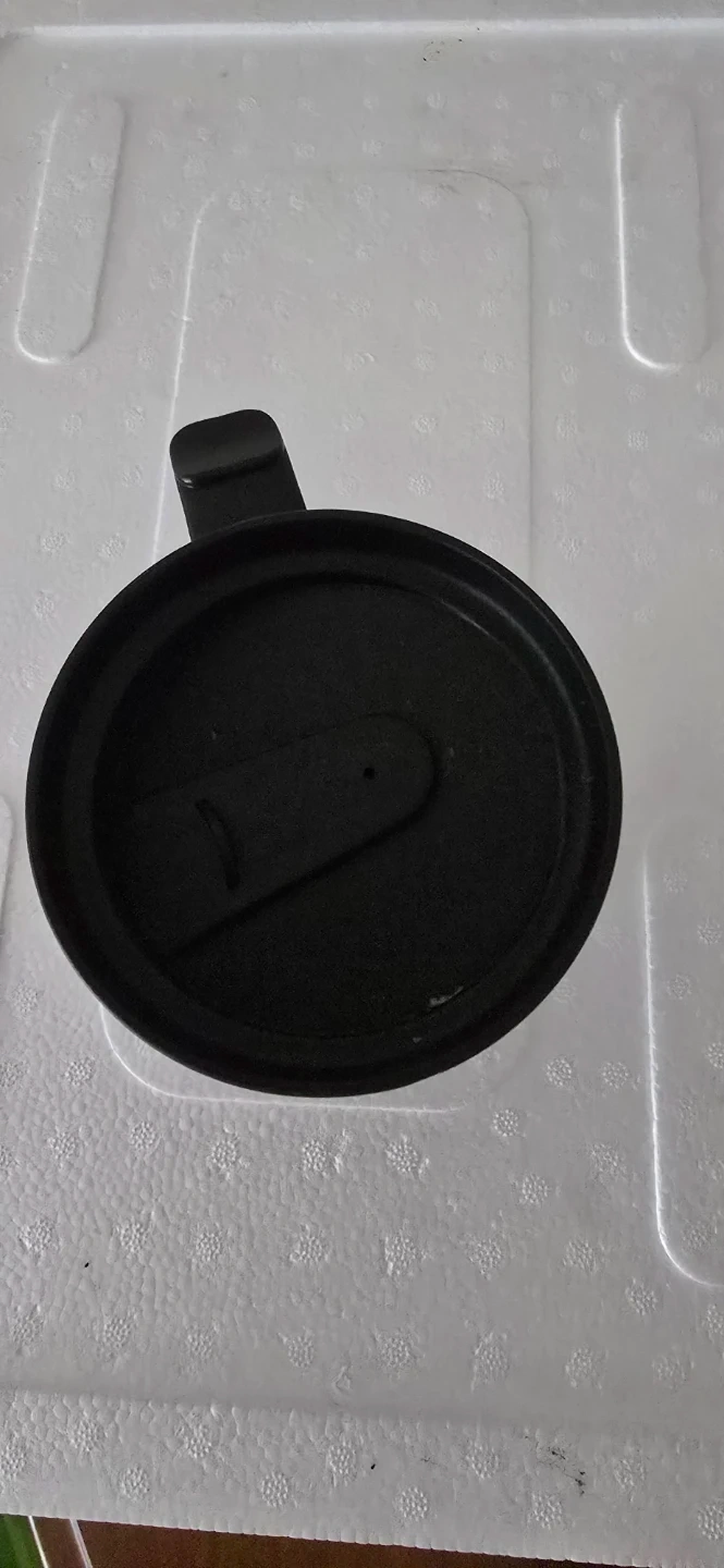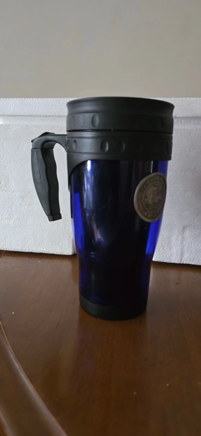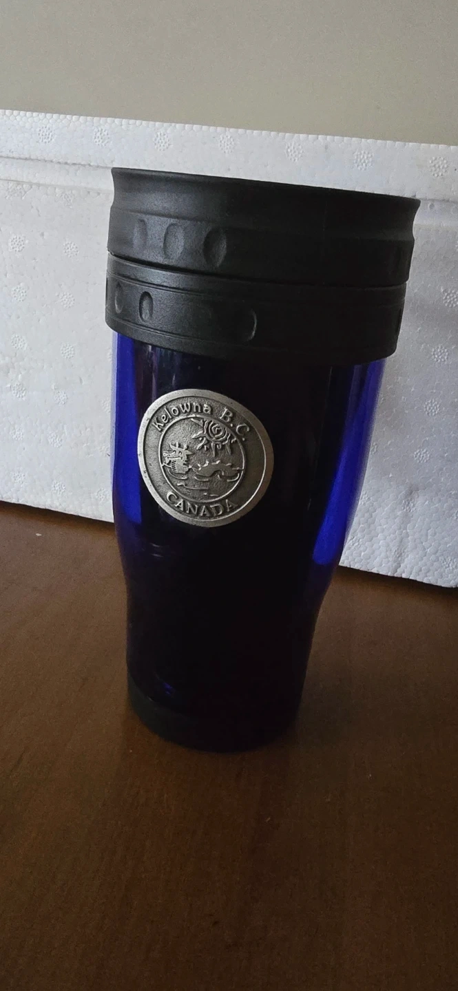 Blue travel mug featuring a Kelowna B.C. Canada emblem. It has a black handle and a black lid. Perfect for taking your hot or cold beverages on the go!