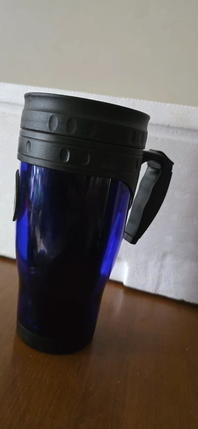 Blue travel mug featuring a Kelowna B.C. Canada emblem. It has a black handle and a black lid. Perfect for taking your hot or cold beverages on the go!