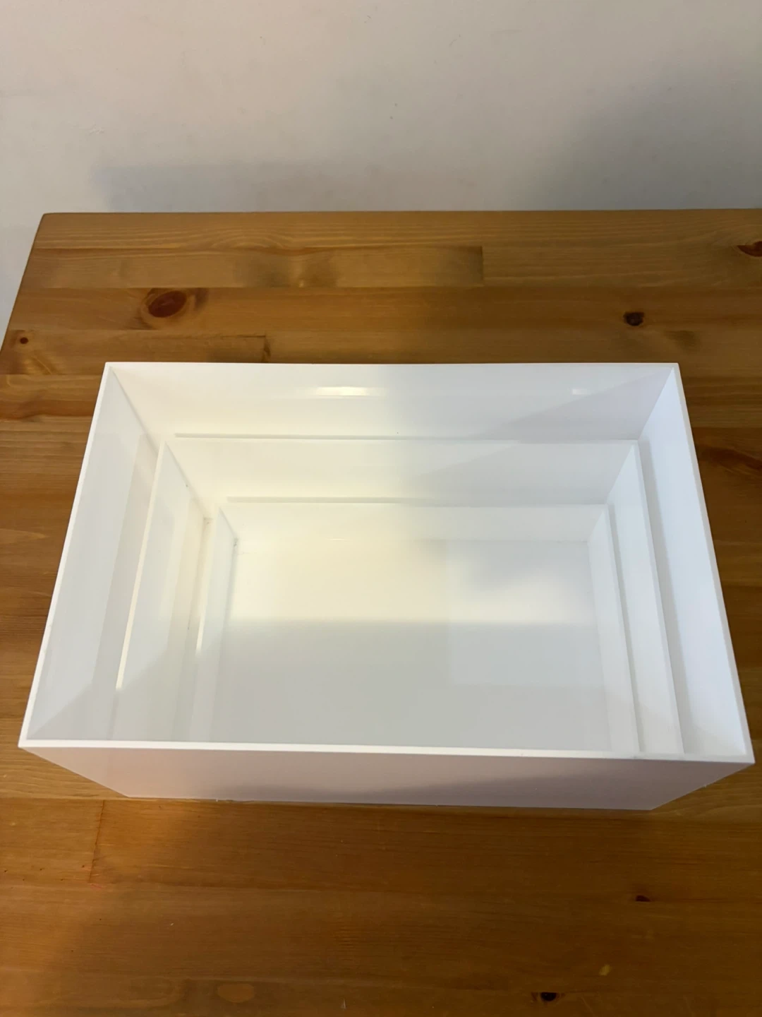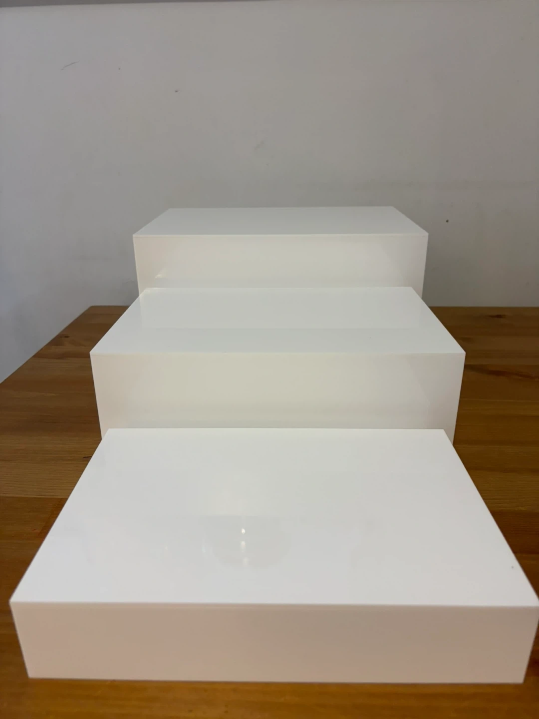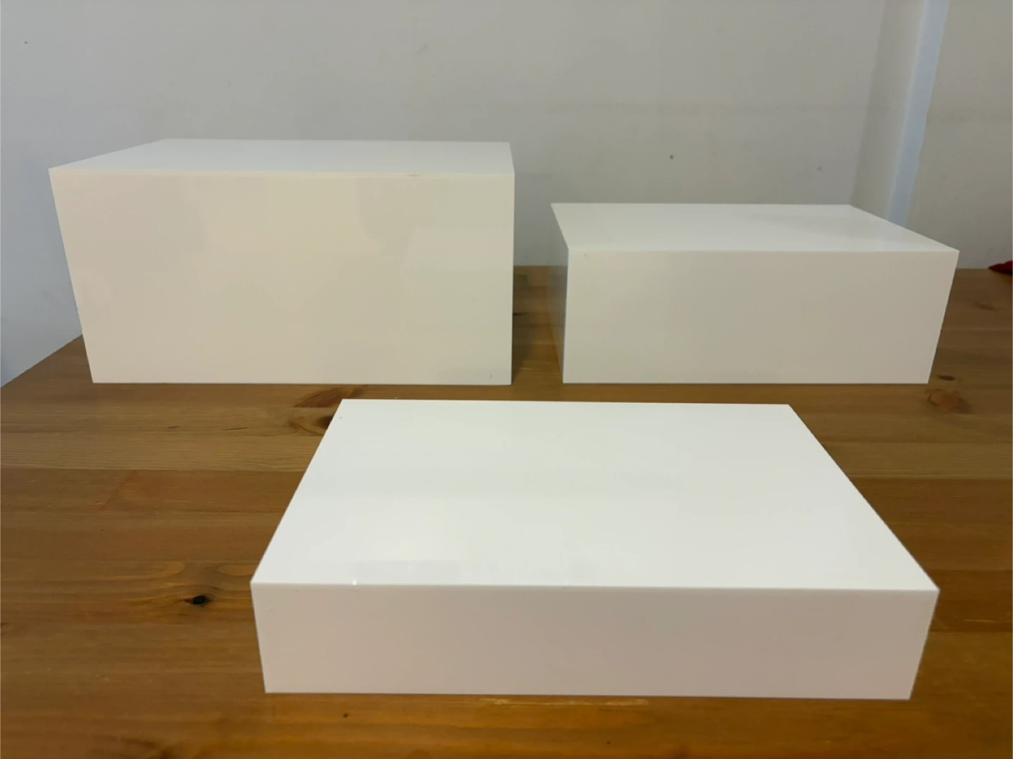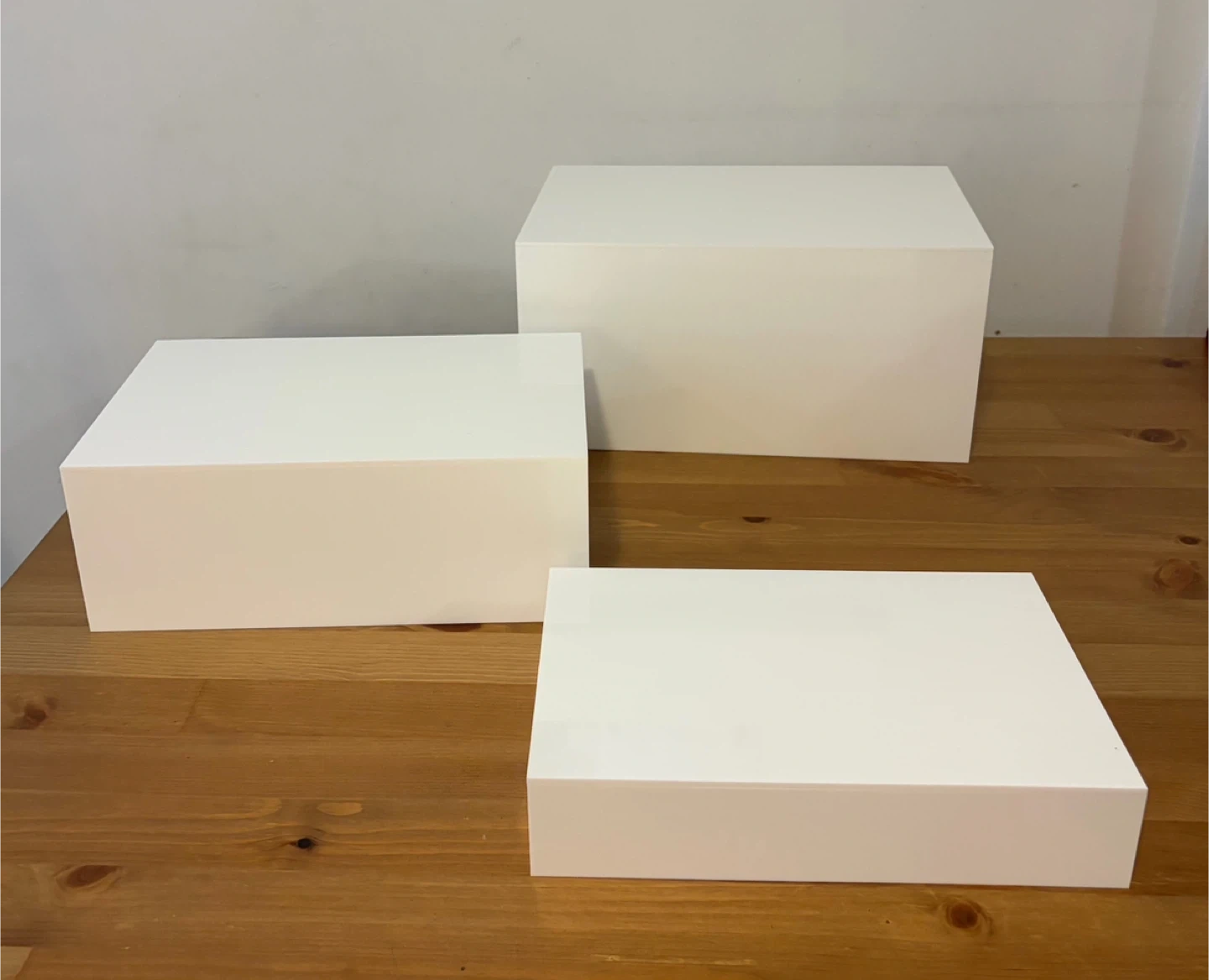 This set includes three white display risers, perfect for showcasing jewelry or desserts. The dimensions are 24cm x 20cm x 5cm, 27cm x 18cm x 10cm, and 30cm x 20cm x 15cm. They're great for event displays or home organization!