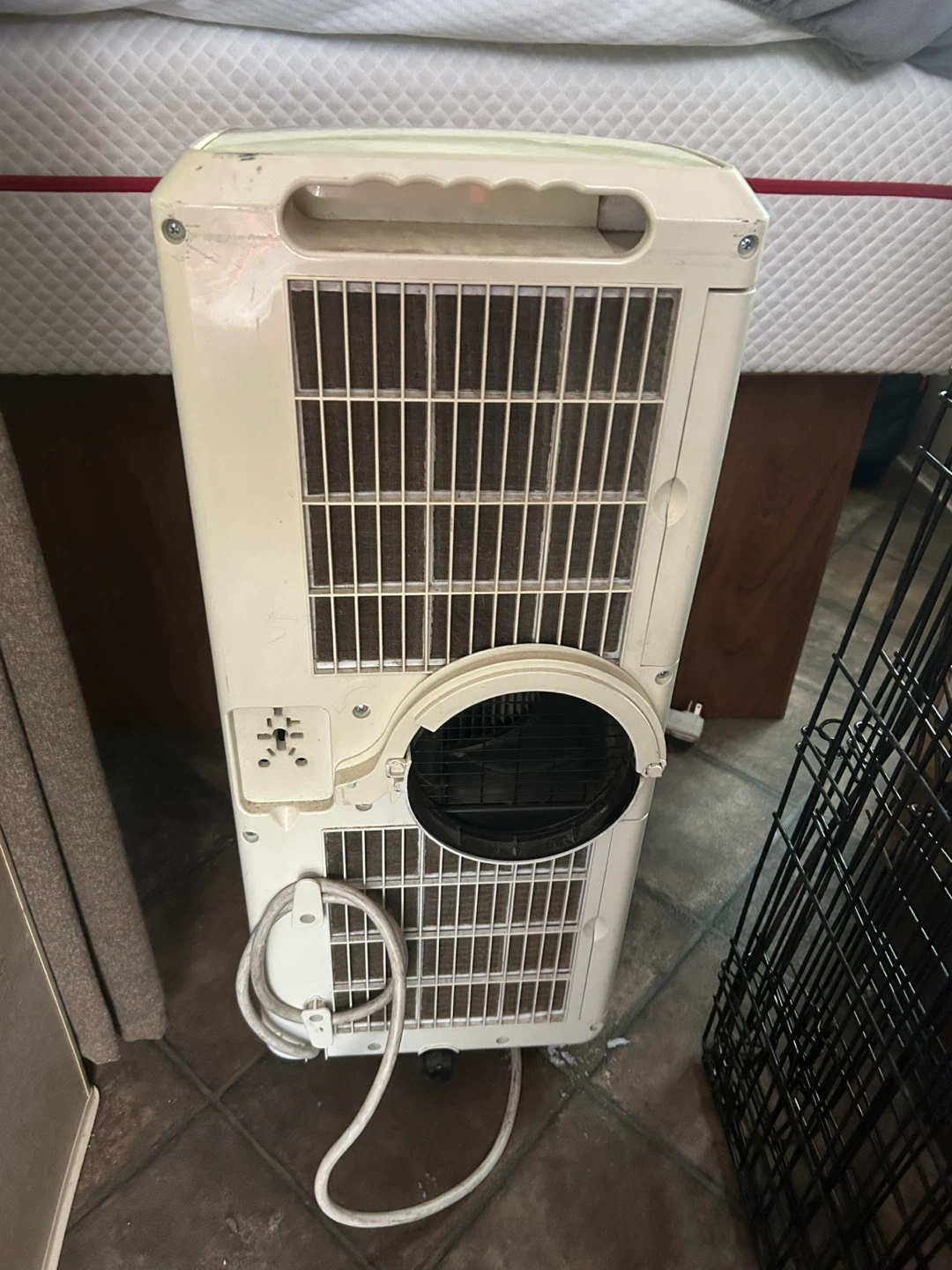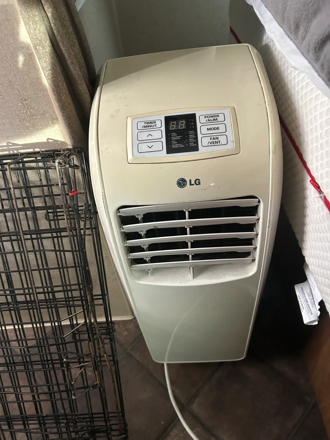 This is an LG portable air conditioner. It has multiple modes including timer and vent functions. The unit is on wheels for easy moving. It's beige in colour.