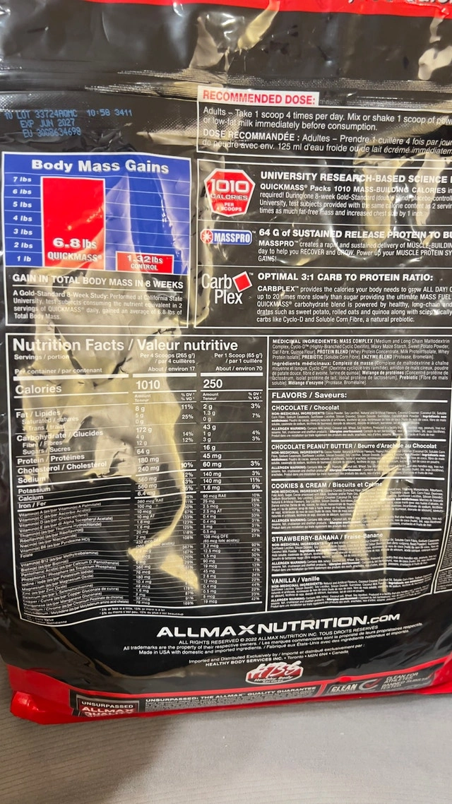 This is a 12 lb bag of Allmax Quickmass Rapid Mass Gain Catalyst in chocolate flavour, perfect for anyone looking to pack on lean body mass quickly! It's in great condition, brand new and sealed, ready to help you achieve your fitness goals. Key features include: 1010 Nutrient-Dense Calories, 64g Protein, and 24 Added Vitamins and Minerals. A 12lb bag usually sells for around $120, but I'm letting this go for a steal. If the ad is up, it's available.