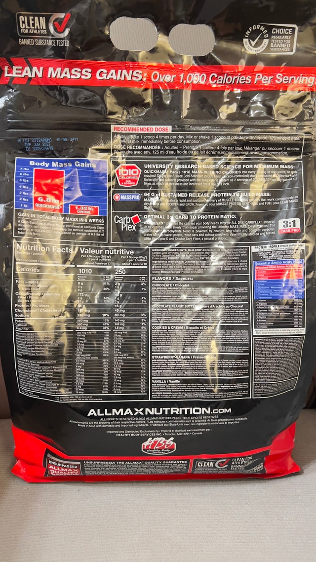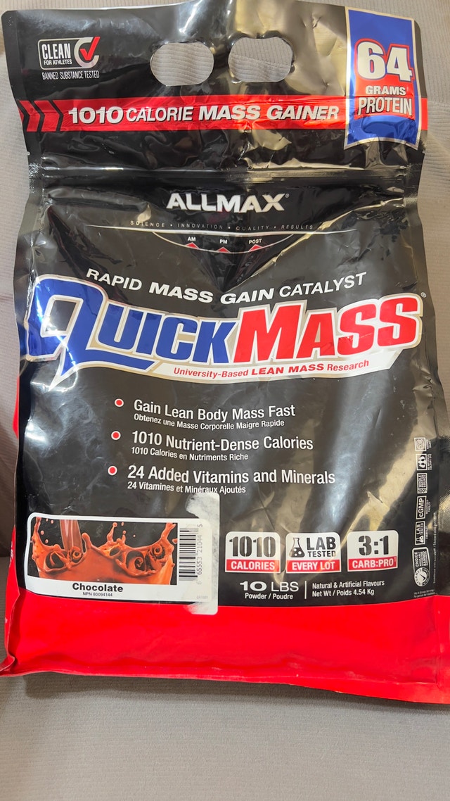 This is a 12 lb bag of Allmax Quickmass Rapid Mass Gain Catalyst in chocolate flavour, perfect for anyone looking to pack on lean body mass quickly! It's in great condition, brand new and sealed, ready to help you achieve your fitness goals. Key features include: 1010 Nutrient-Dense Calories, 64g Protein, and 24 Added Vitamins and Minerals. A 12lb bag usually sells for around $120, but I'm letting this go for a steal. If the ad is up, it's available.