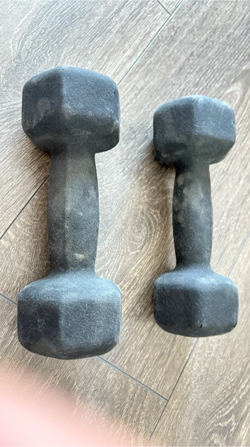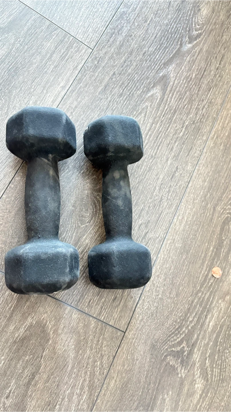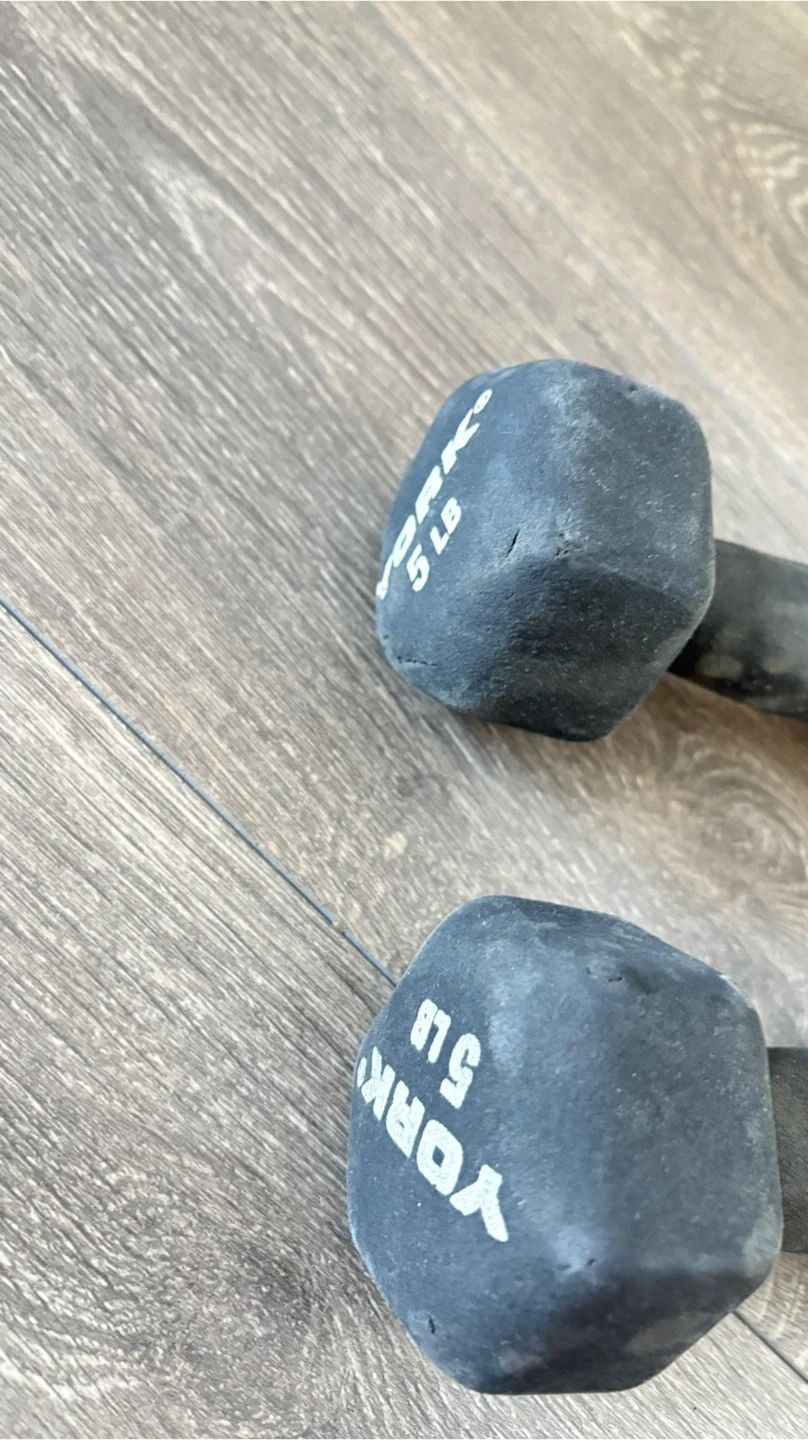 A pair of York 5 lb dumbbells. These weights are coated for a comfortable grip and durability. They're great for various home workouts and strength training.