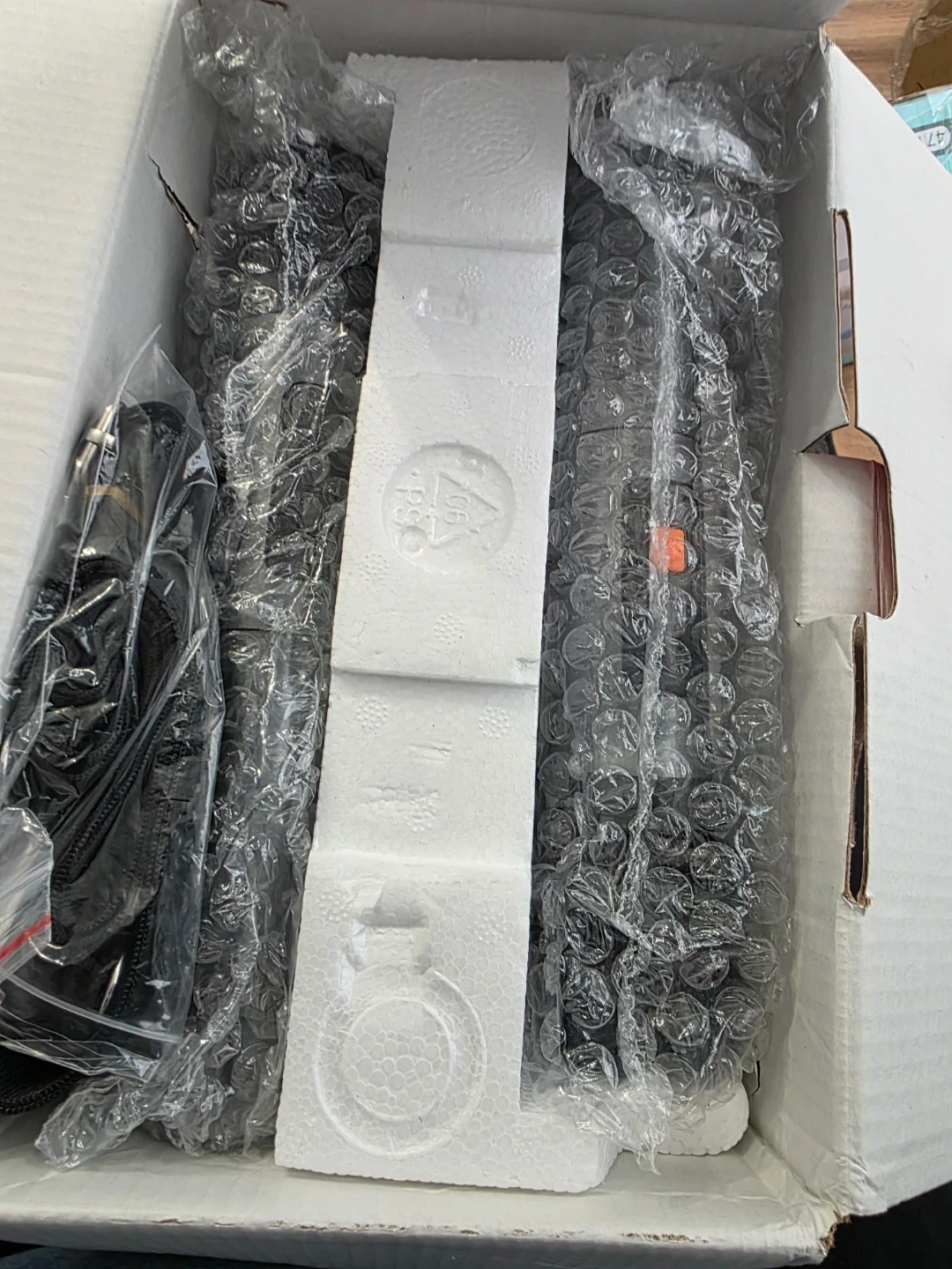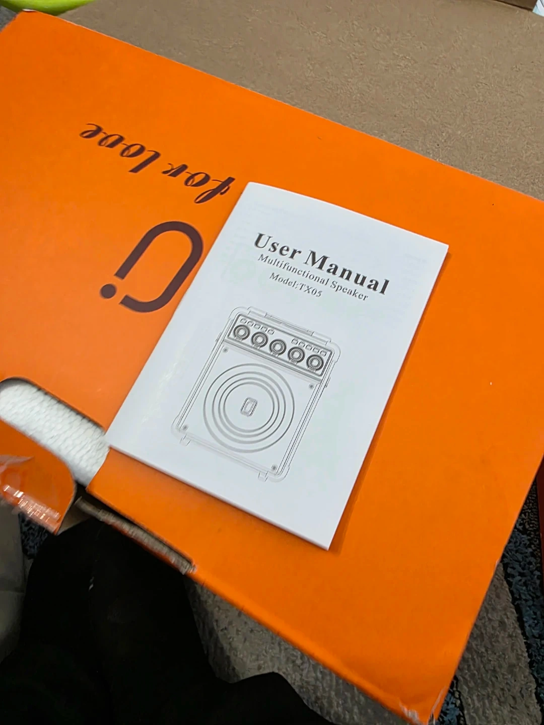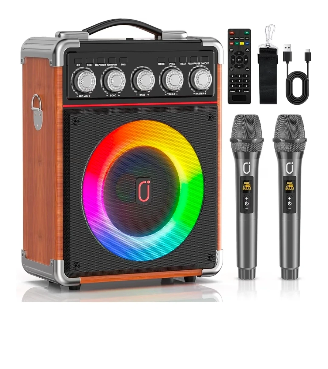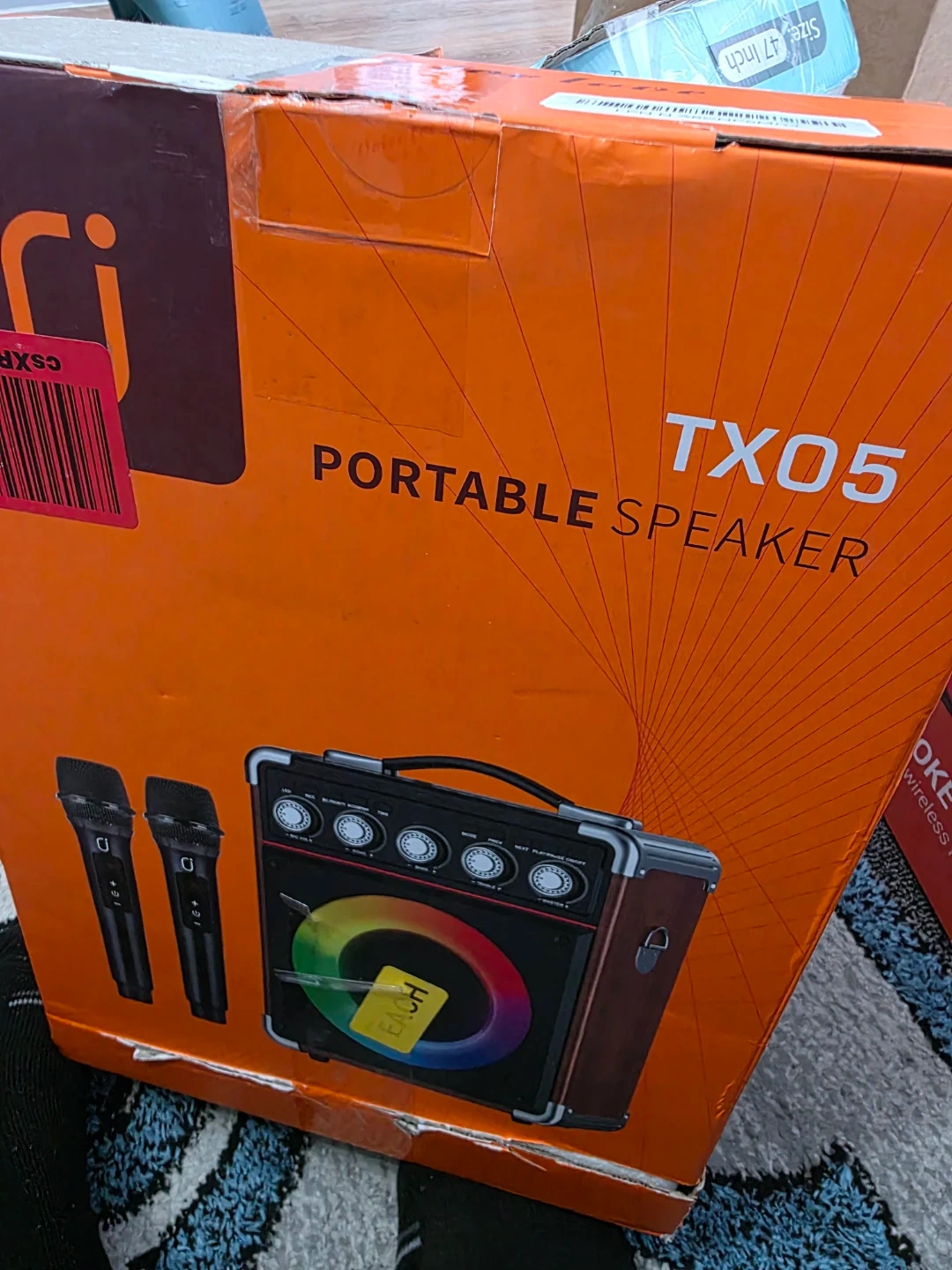 This portable speaker, model TX05, comes with two microphones. It features a light-up speaker and a carrying handle. Includes remote control and charging cables.