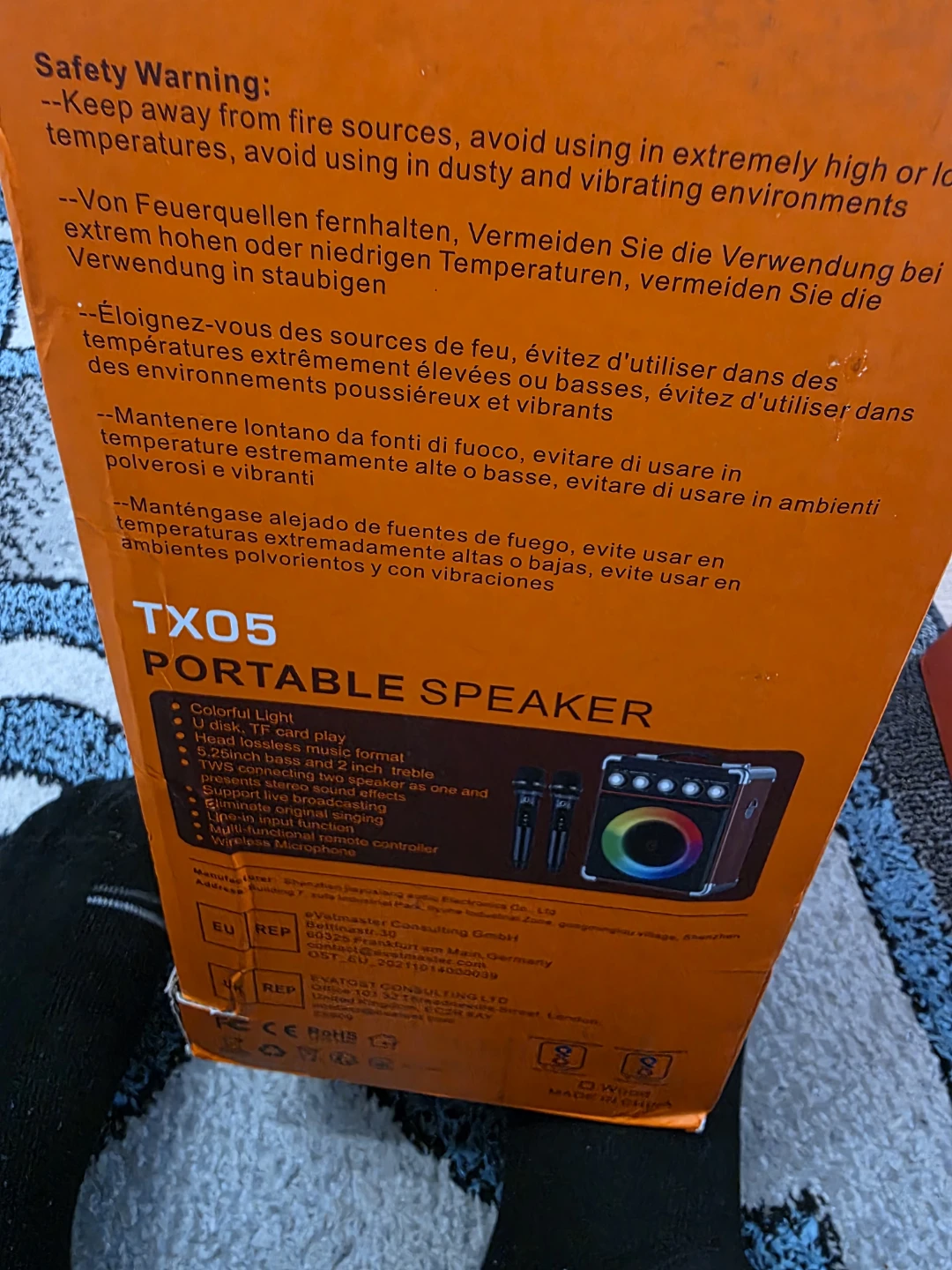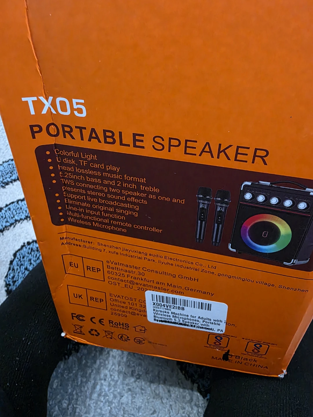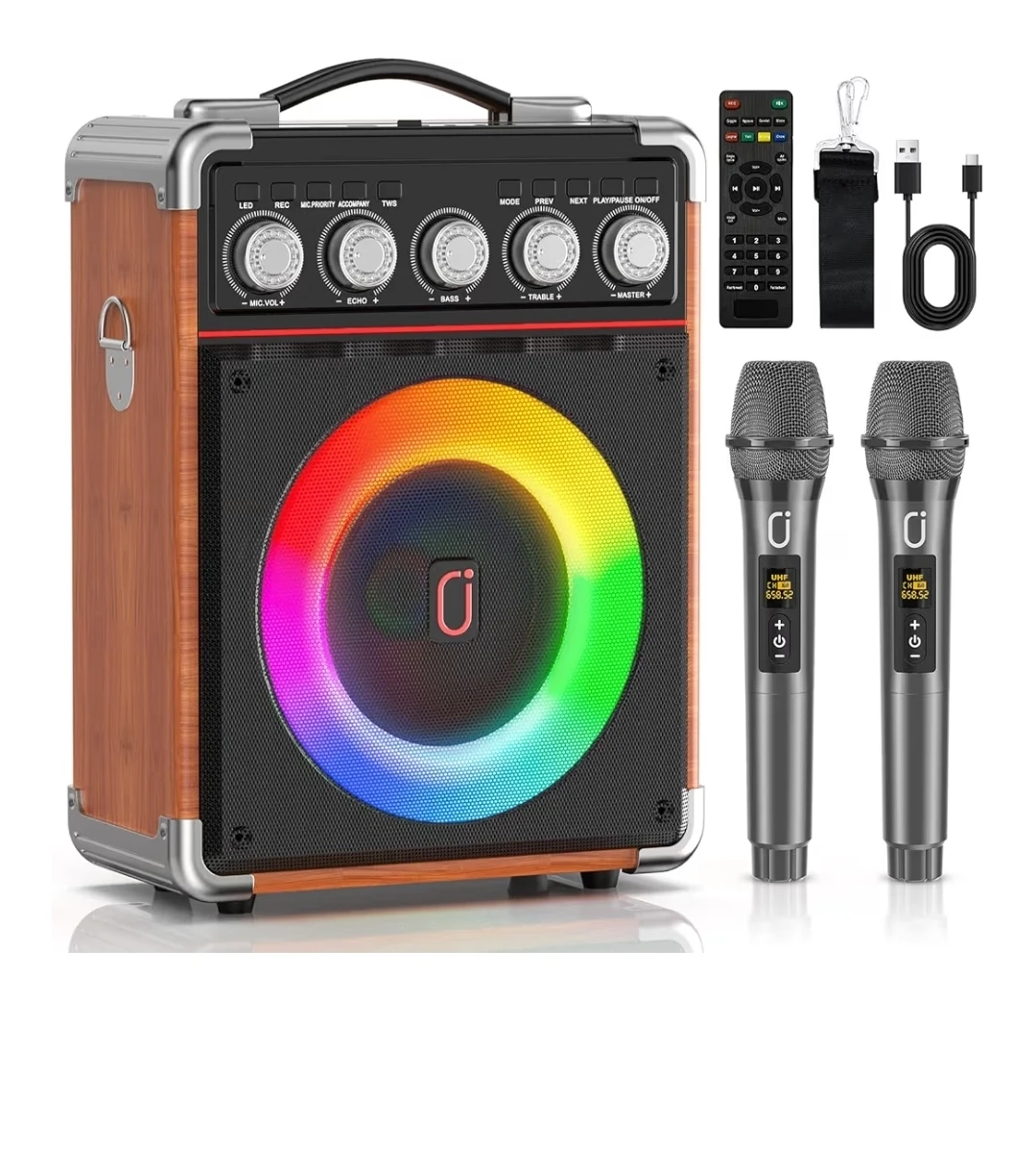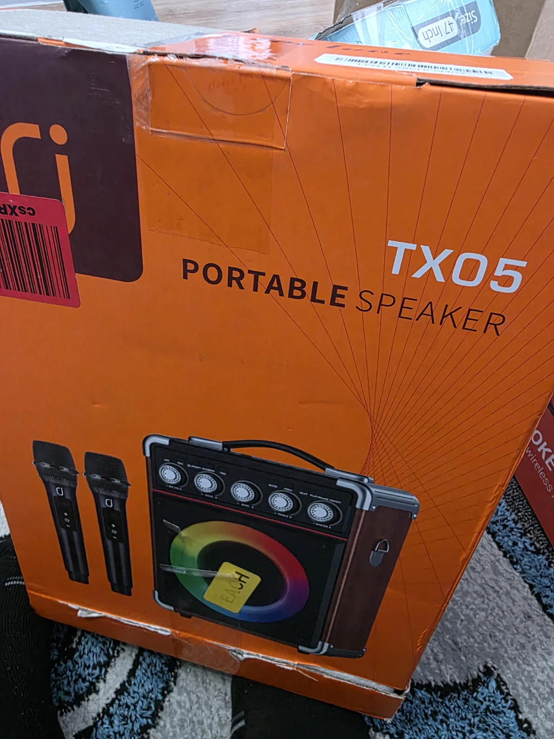 This portable speaker, model TX05, comes with two microphones. It features a light-up speaker and a carrying handle. Includes remote control and charging cables.