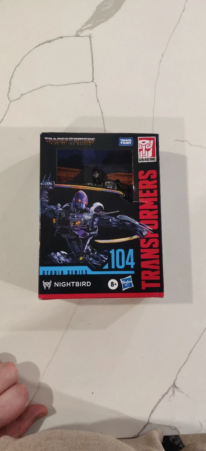 This is the Transformers Studio Series Deluxe Class Nightbird figure, number 104. It's suitable for ages 8 and up. The packaging includes the original box.