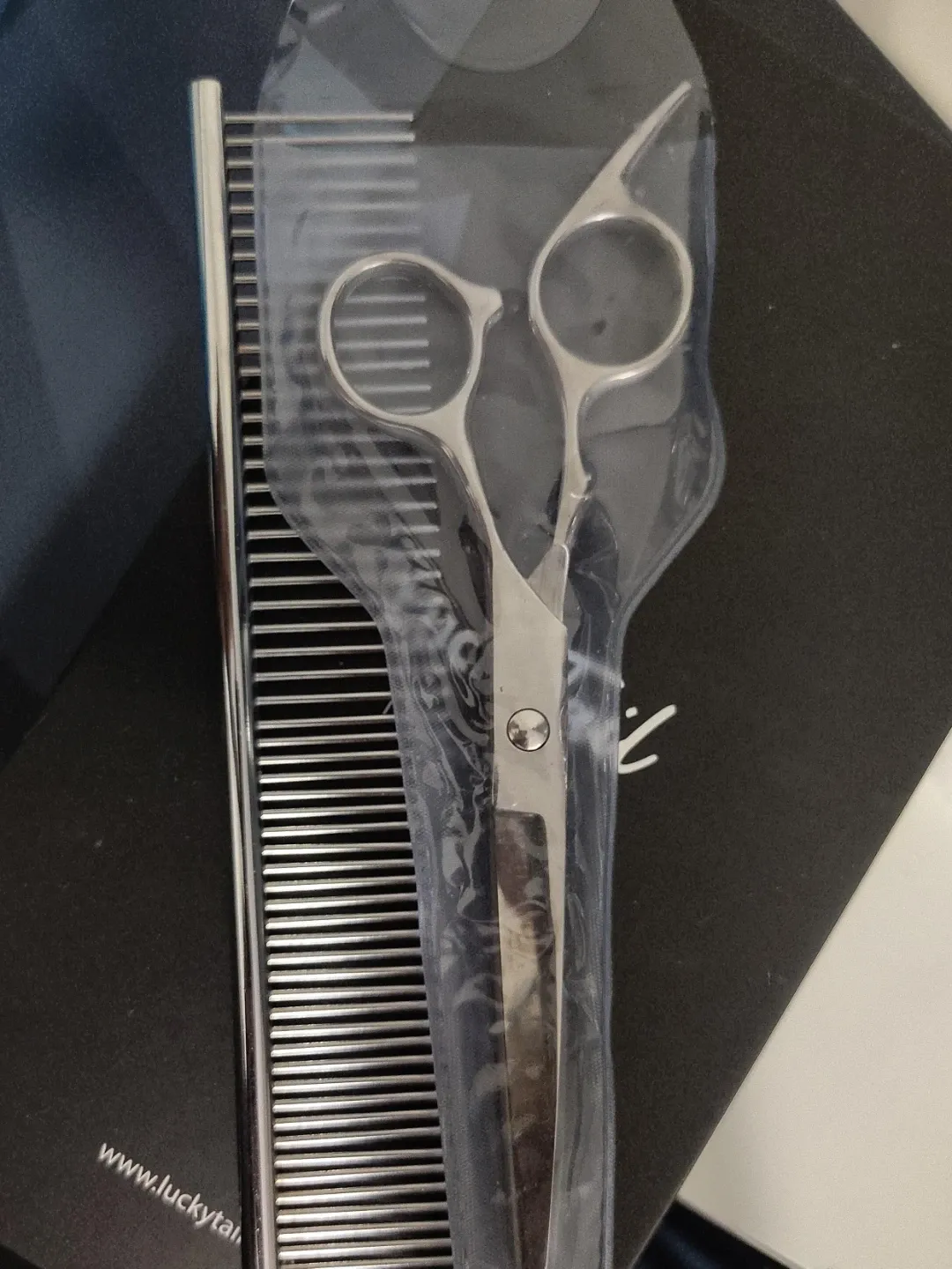 This set includes stainless steel grooming scissors and a metal comb. The scissors are designed for precision grooming. It's great for keeping your pet looking their best!