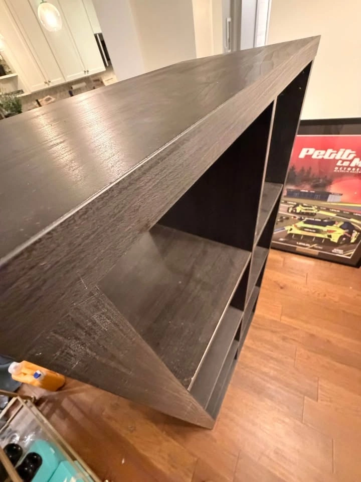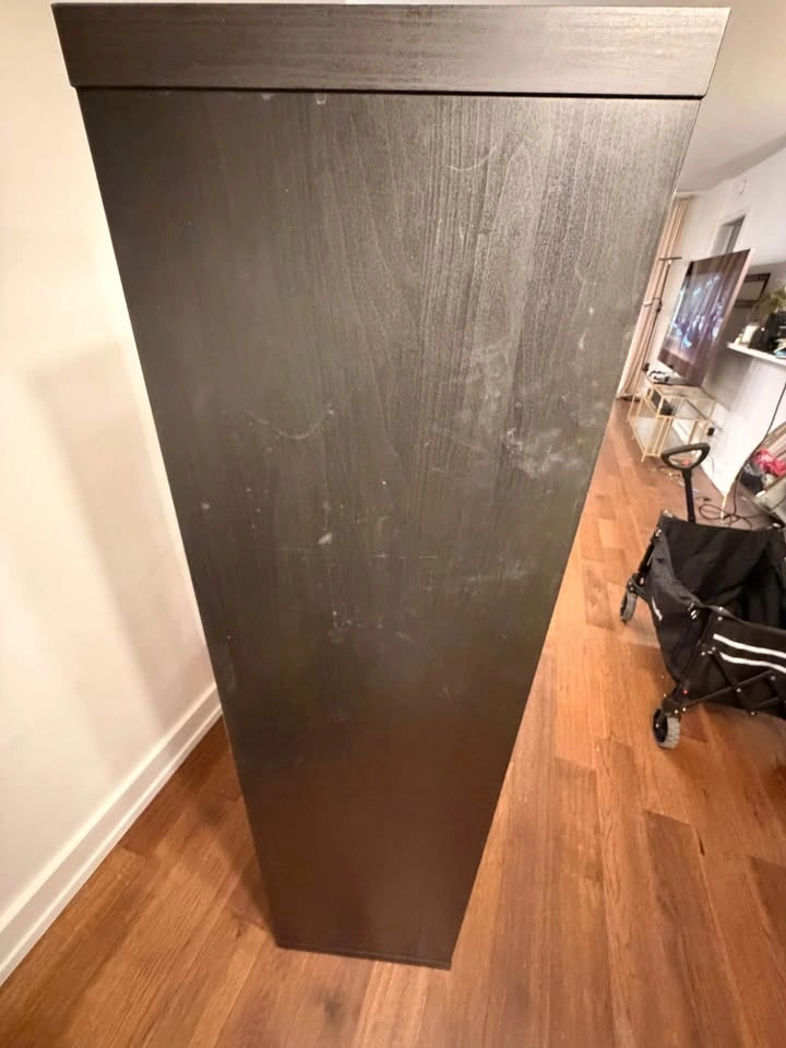 Very good used condition. Sturdy and clean with only light, normal wear. Works great as a bookcase, storage unit, bar cabinet, or room divider. Modern, simple design that fits well in apartments, offices, or bedrooms. All shelves are solid and level. Approx. size: 30” W x 58” H x 15” D