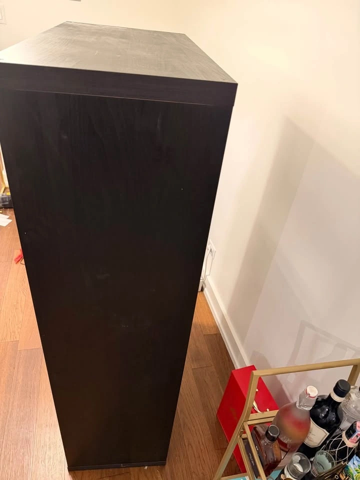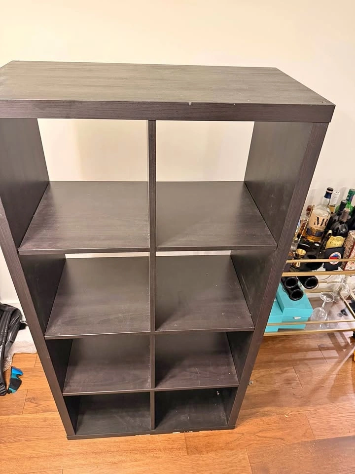 Very good used condition. Sturdy and clean with only light, normal wear. Works great as a bookcase, storage unit, bar cabinet, or room divider. Modern, simple design that fits well in apartments, offices, or bedrooms. All shelves are solid and level. Approx. size: 30” W x 58” H x 15” D