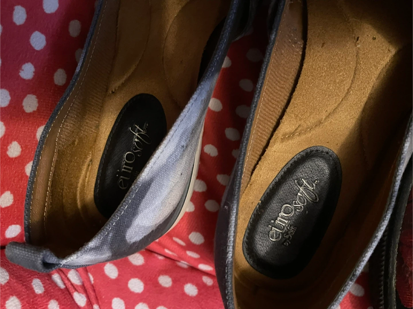 One pair Eurosoft by Sofft grey camouflage fabric slip-on shoes! They're in great condition and ready for a new owner. Perfect for a casual day out or just lounging around at home. Reinforced padded interior.
