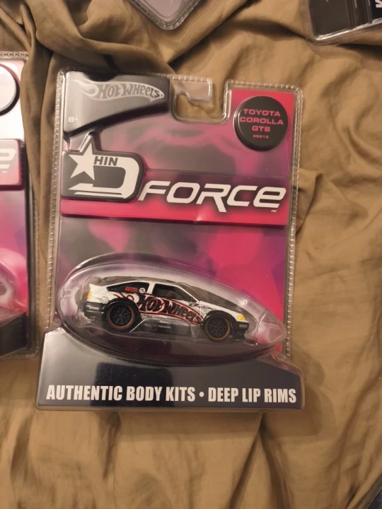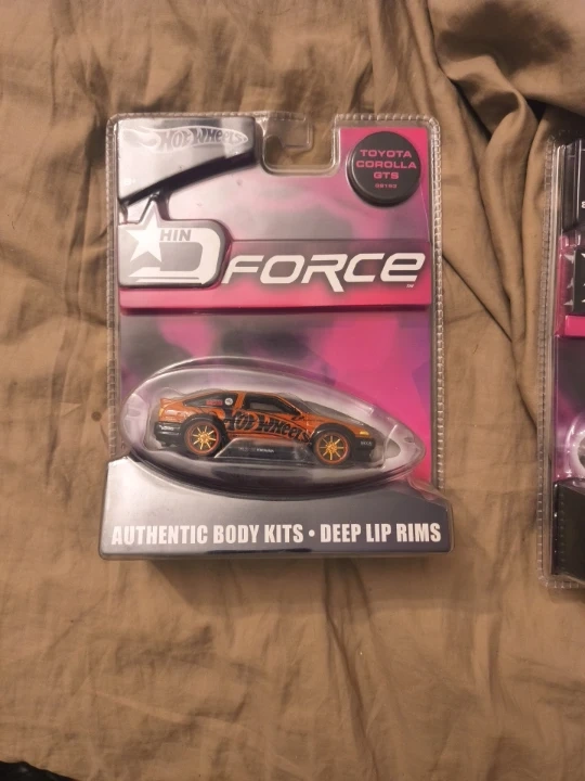 Collection of Hot Wheels D-Force die-cast model cars, featuring authentic body kits and deep lip rims. Includes Toyota Corolla GTS and Mazda RX-7 models. Perfect for collectors!