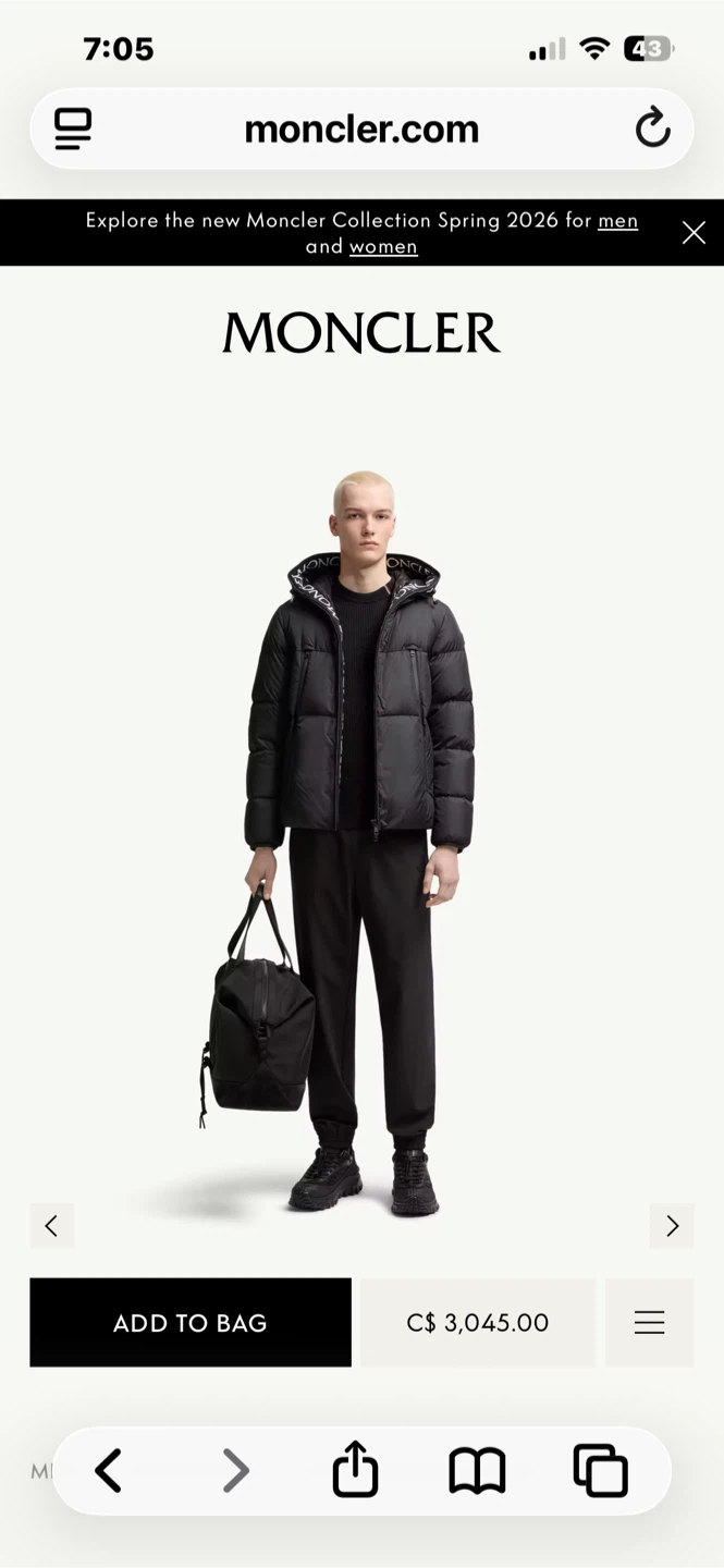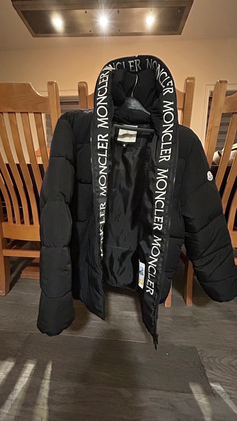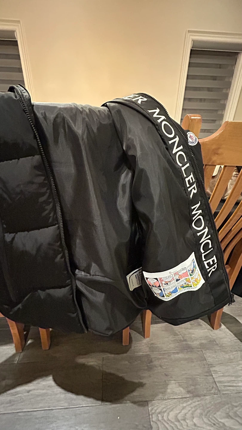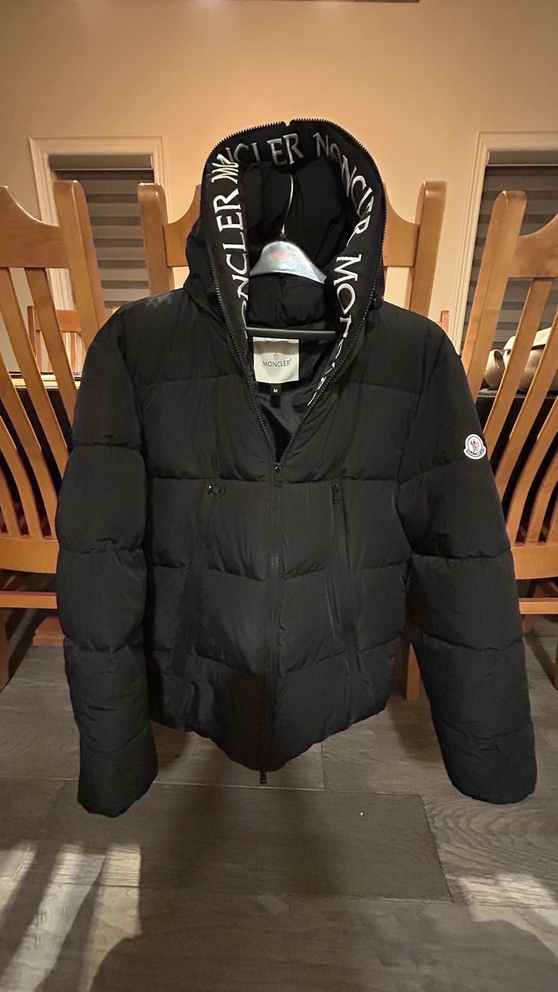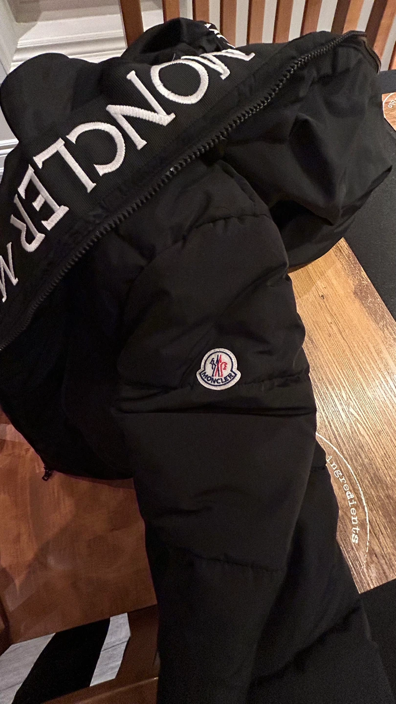 Black Moncler men’s puffer jacket. It's a stylish and warm outerwear piece for cooler weather. The jacket is made with quality materials. It's a great choice for everyday wear.