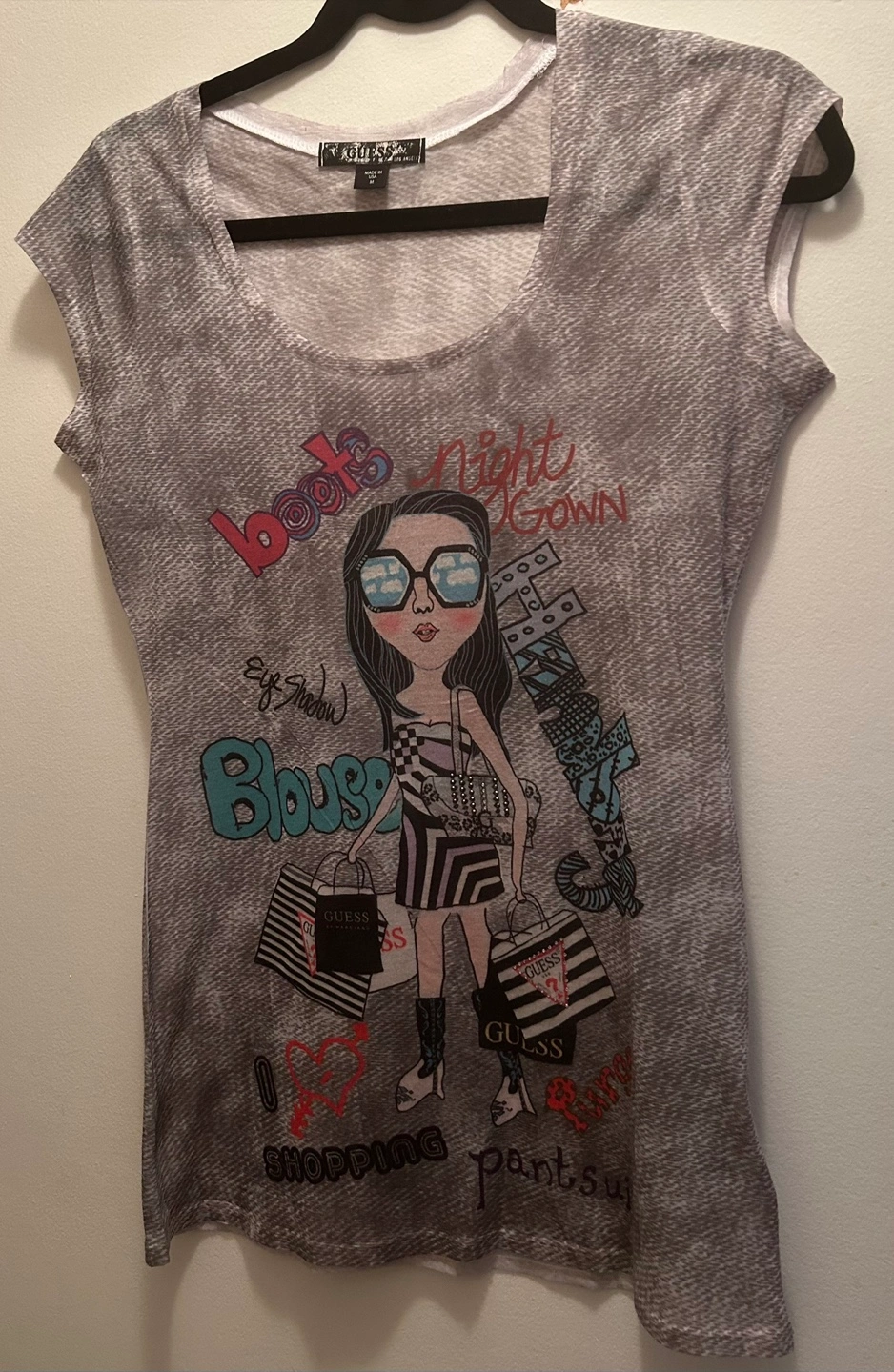 Grey short sleeve t-shirt. Features a graphic design of a girl carrying shopping bags. Scoop neckline. Size M.