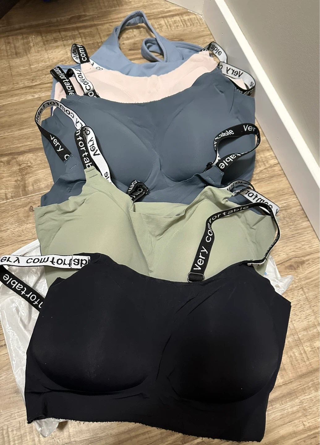 Set of four women's comfort bras in assorted colours: black, sage green, slate blue, and pale pink. Each bra has a 'Very Comfortable' logo band. Made from a soft, stretchy material for all-day wear.