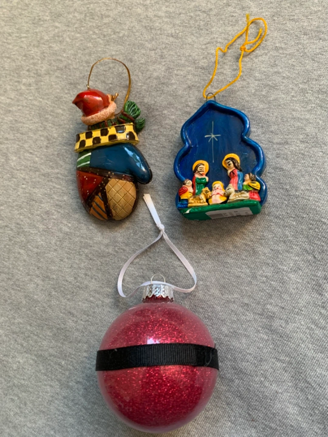 One is a sparkly red ball with a black ribbon and buckle detail meant to depict a Santa Claus suit. Another is a bear in a mitten, the tip of his hat has snapped and broken off. The third depicts a Nativity scene with the Holy Family that needs a bit of green touch up paint where it’s chipped.