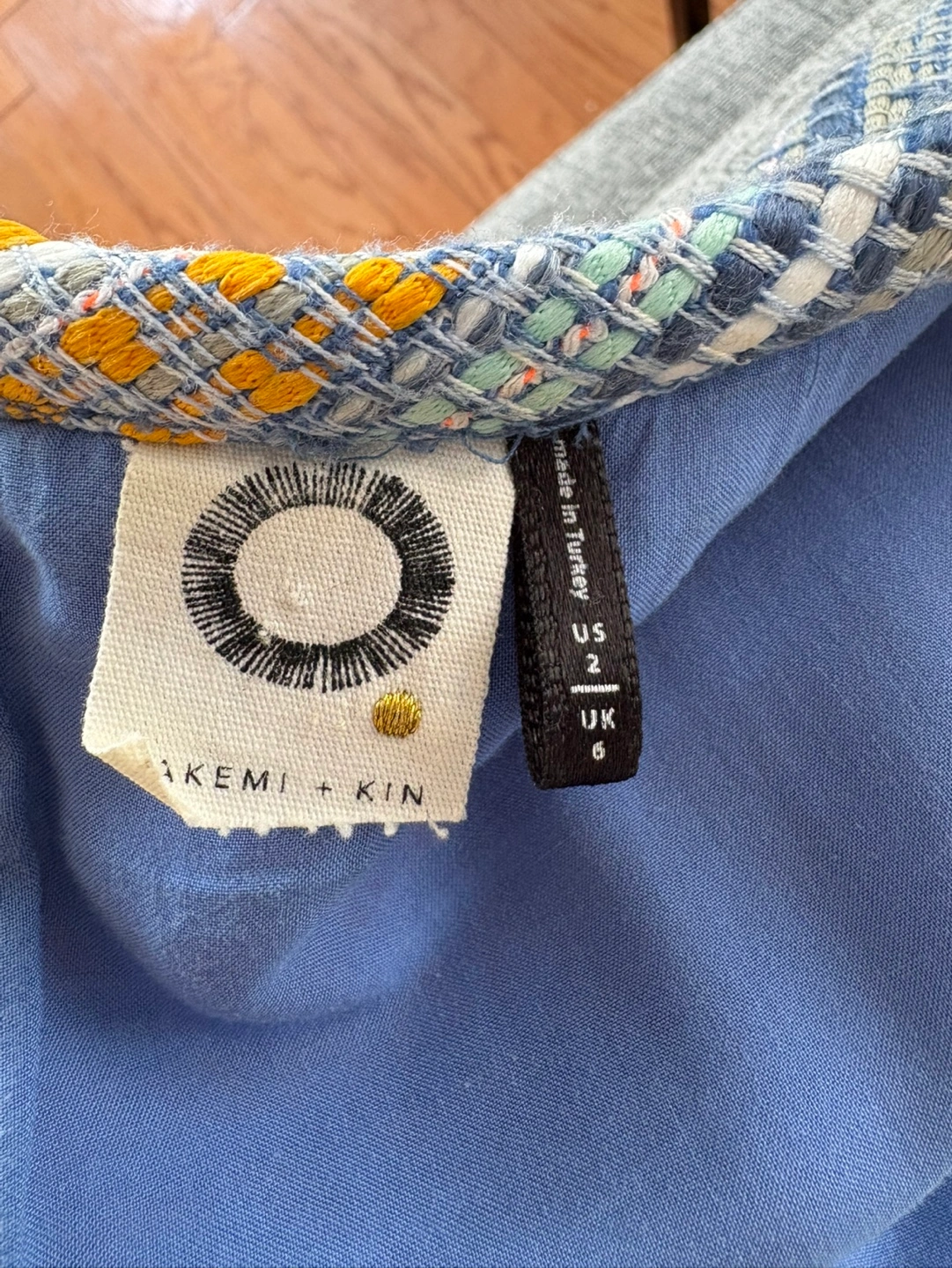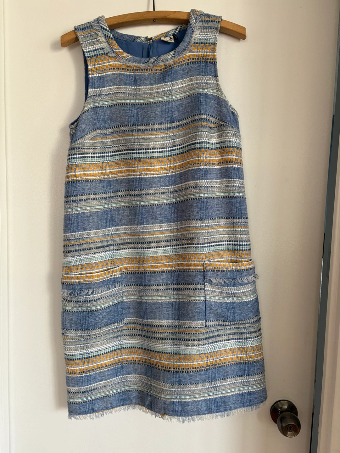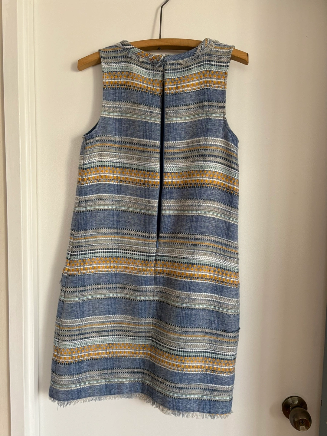 Blue and gold striped sleeveless mini dress. Features pockets and frayed hem.