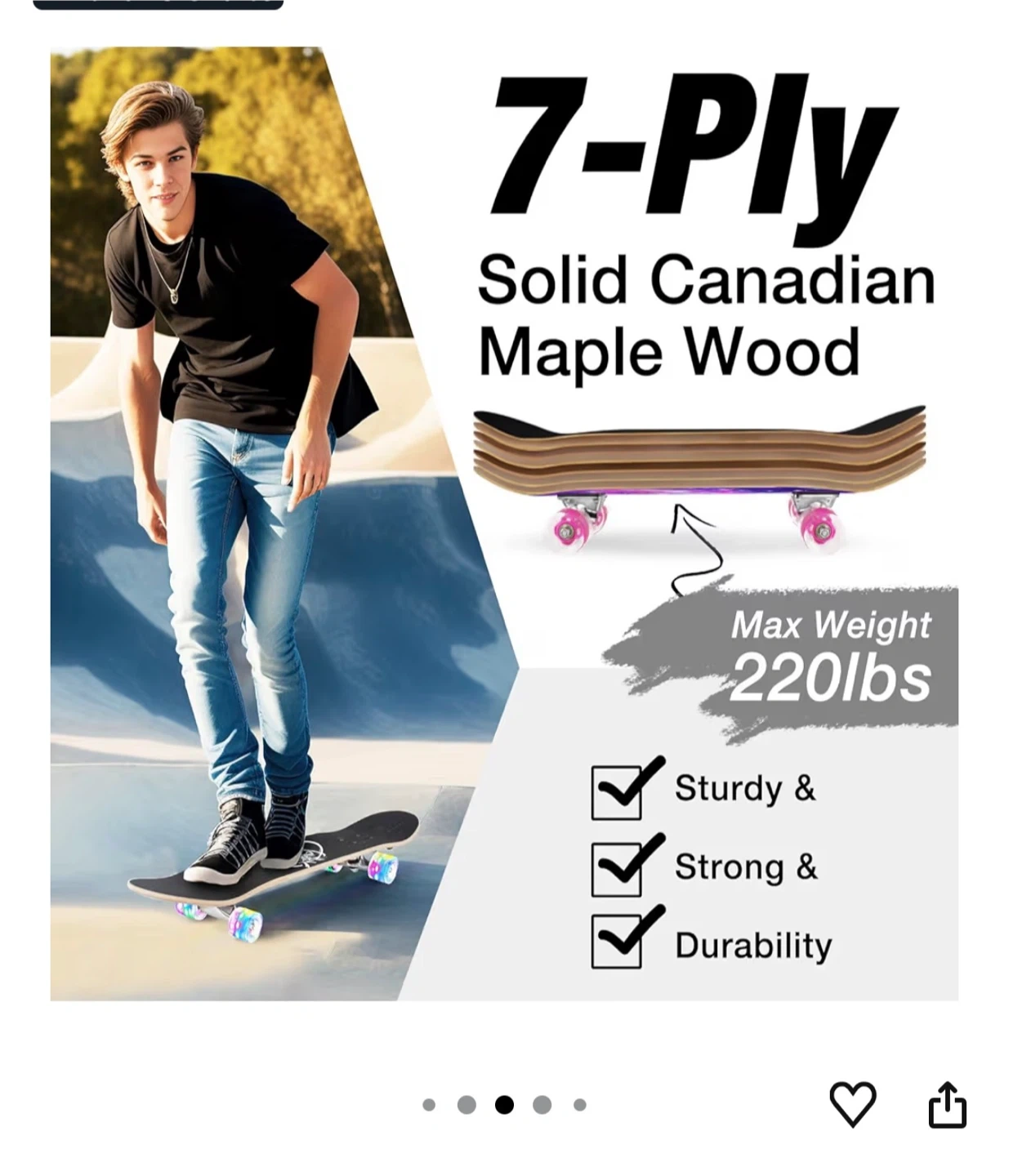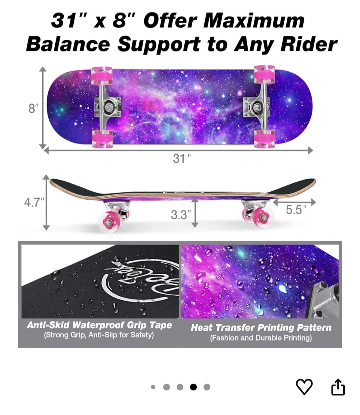 This BeTeer skateboard features a galaxy purple design. It's made with 7-ply solid Canadian maple wood and has 95A PU wheels with ABEC-7 precision bearings. The deck measures 31" x 8" and supports up to 220lbs. It also includes battery-free LED flashing wheels.