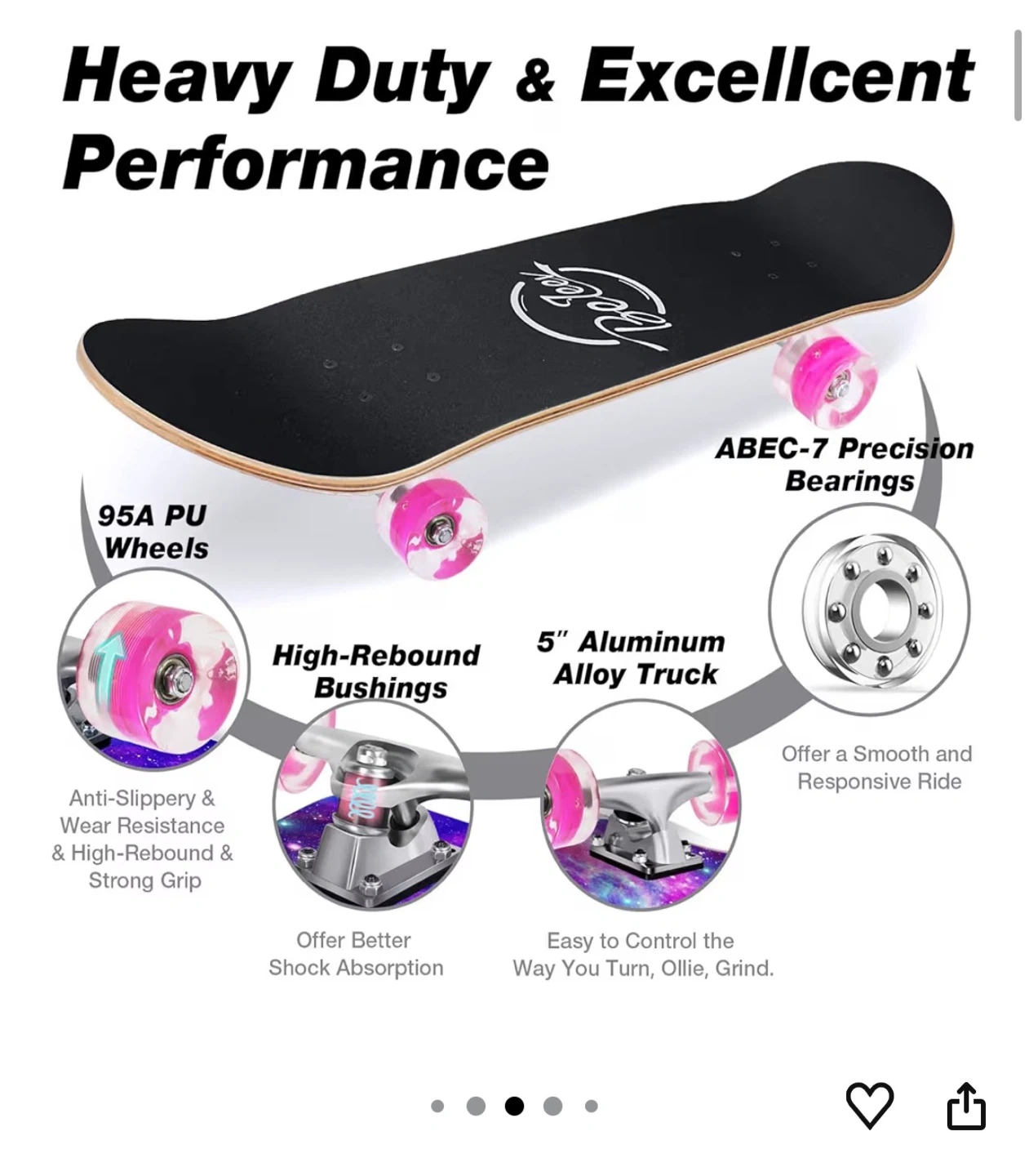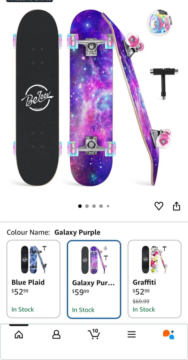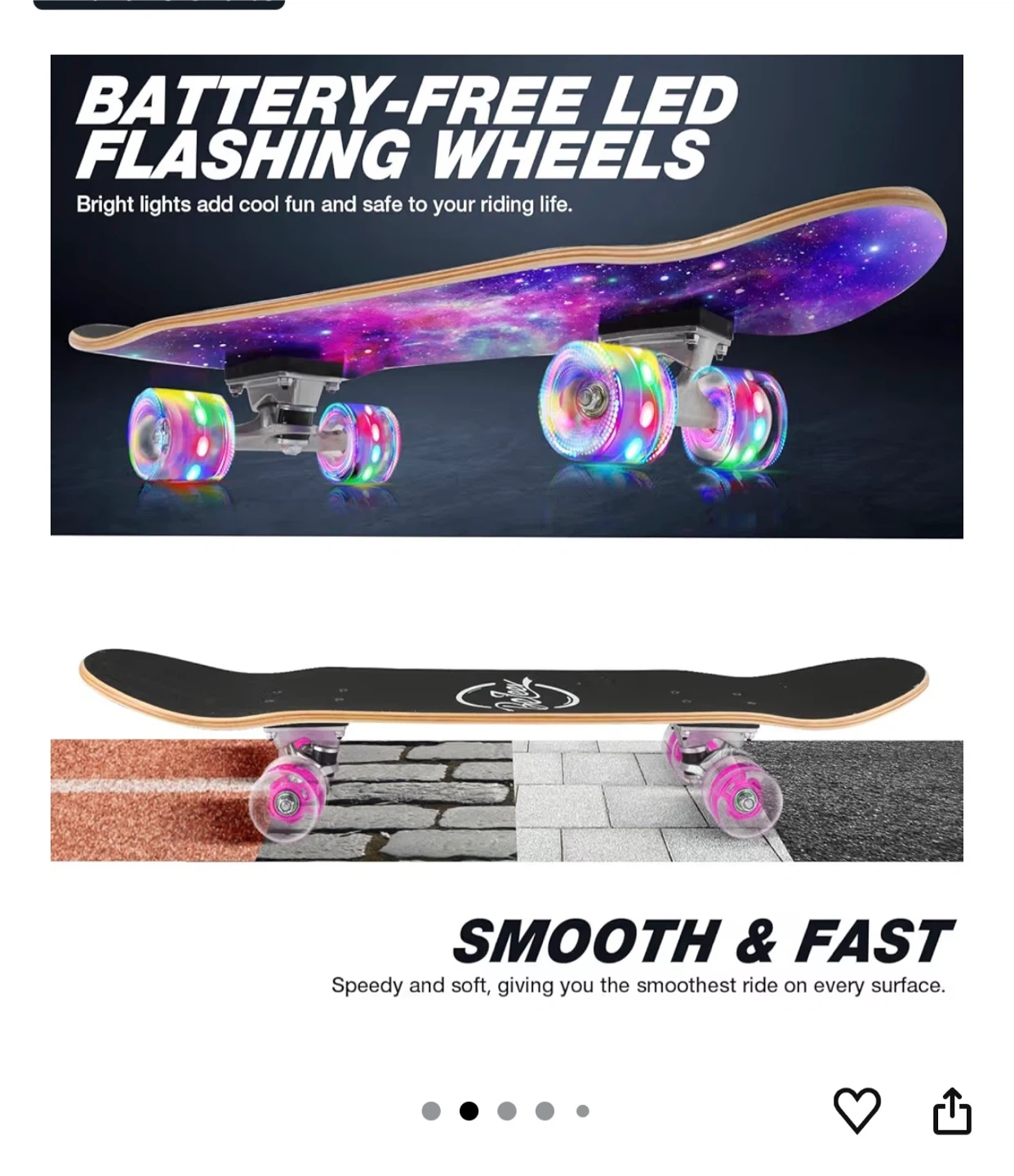 This BeTeer skateboard features a galaxy purple design. It's made with 7-ply solid Canadian maple wood and has 95A PU wheels with ABEC-7 precision bearings. The deck measures 31" x 8" and supports up to 220lbs. It also includes battery-free LED flashing wheels.