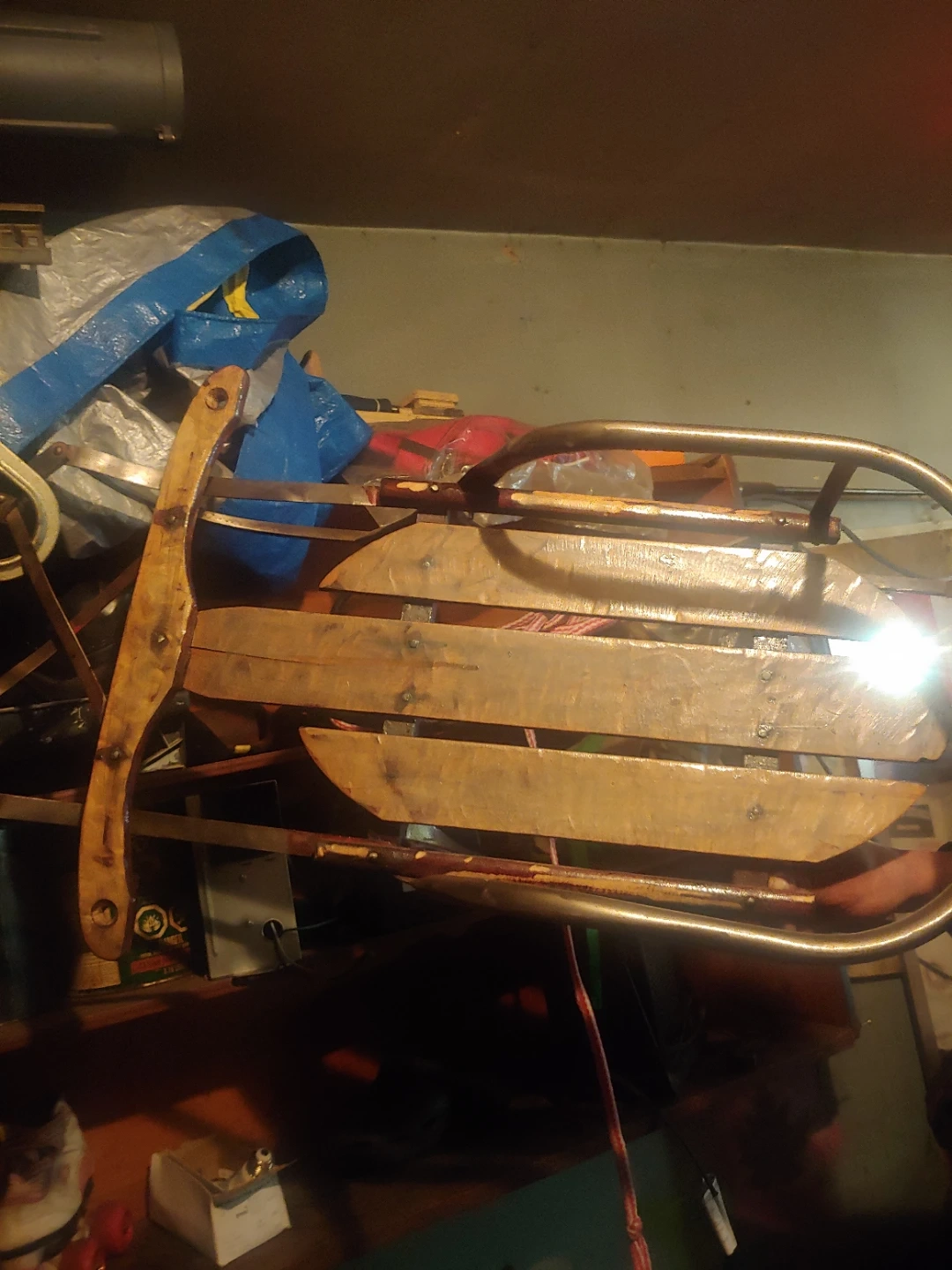 This is a classic wooden toboggan sled. It features a durable metal frame and wooden slats for a smooth ride. Great for enjoying snowy hills!