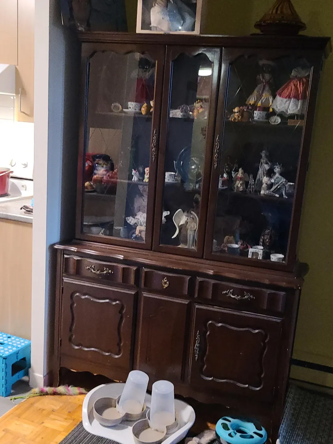 Selling a vintage wooden china cabinet. It features a glass-front display area up top and cabinet space below for storage. A beautiful addition to any dining or living room!