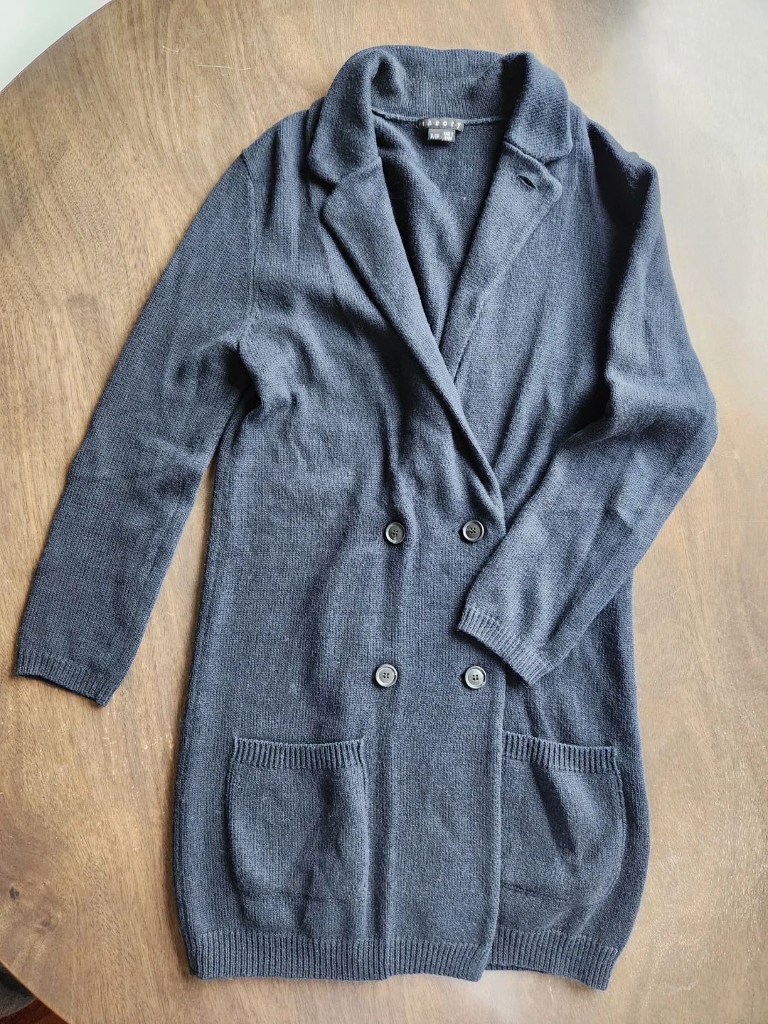 Selling a Theory knit blazer-shaped mid length cardigan in a dark navy colour. It's a size P/TP (petite Small). It's in great condition and perfect for layering or wearing on its own!