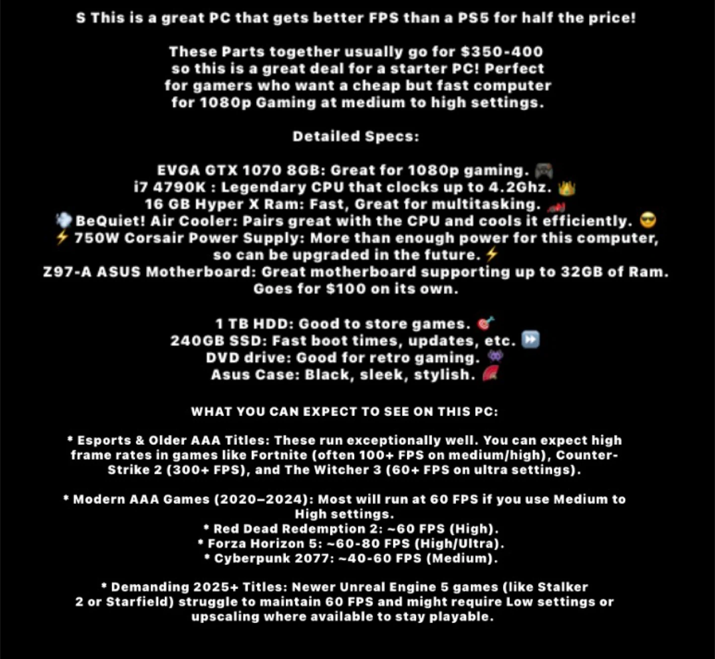 This is a great PC that gets better FPS than a PS5 for half the price! Feel free to ask any questions.