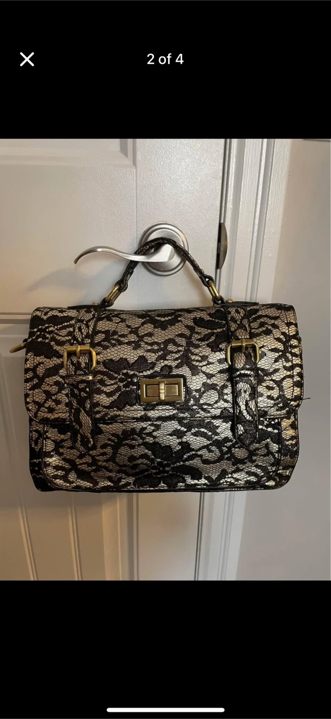 This purse features a beautiful black and gold lace design. It has a structured shape and a detachable shoulder strap. Perfect for adding a touch of glam to any outfit!