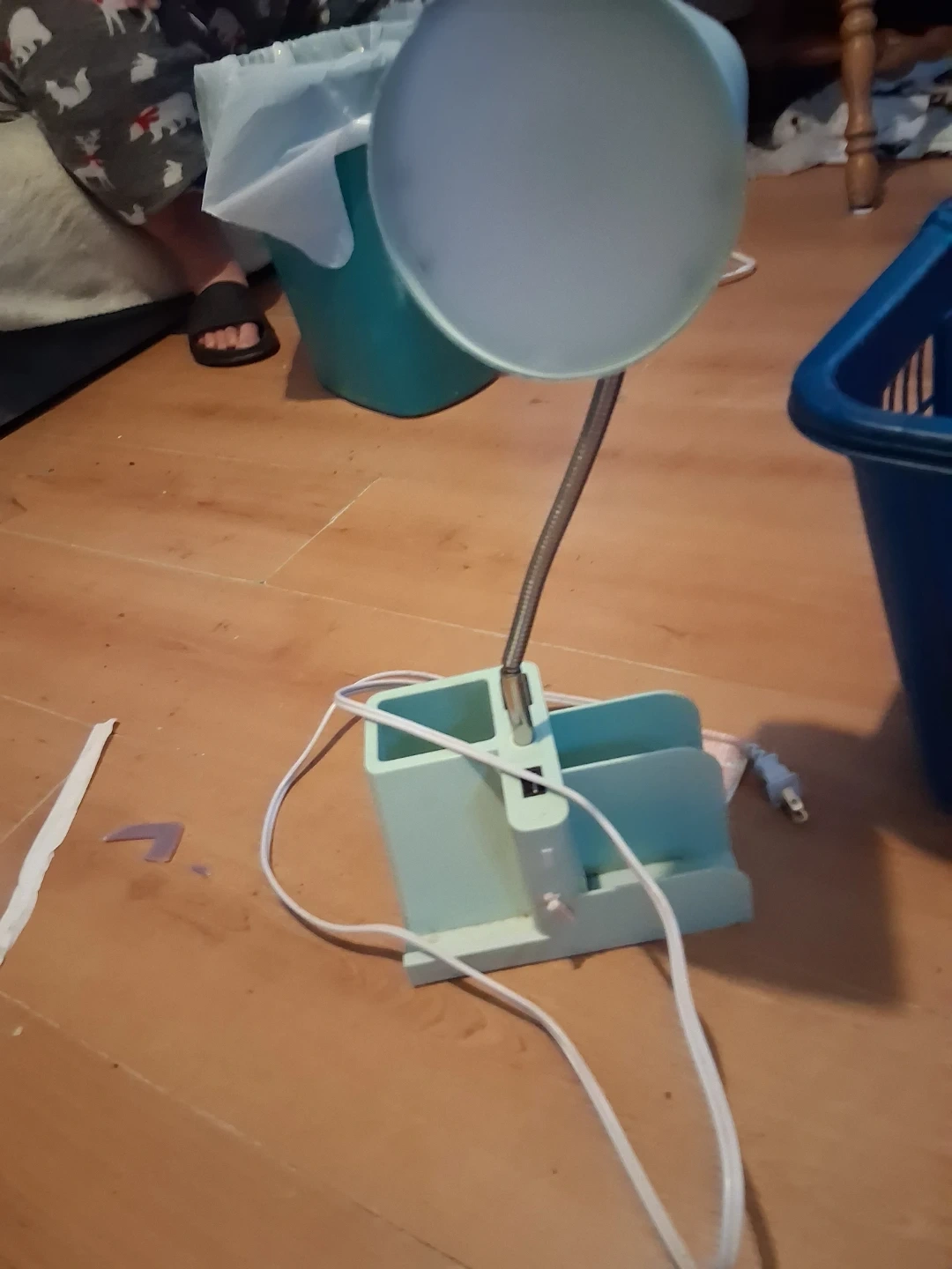 Adjustable desk lamp with a built-in organizer base. The lamp features a flexible gooseneck for positioning. The base has compartments for pens and other small items. It's powered by a standard electrical cord.
