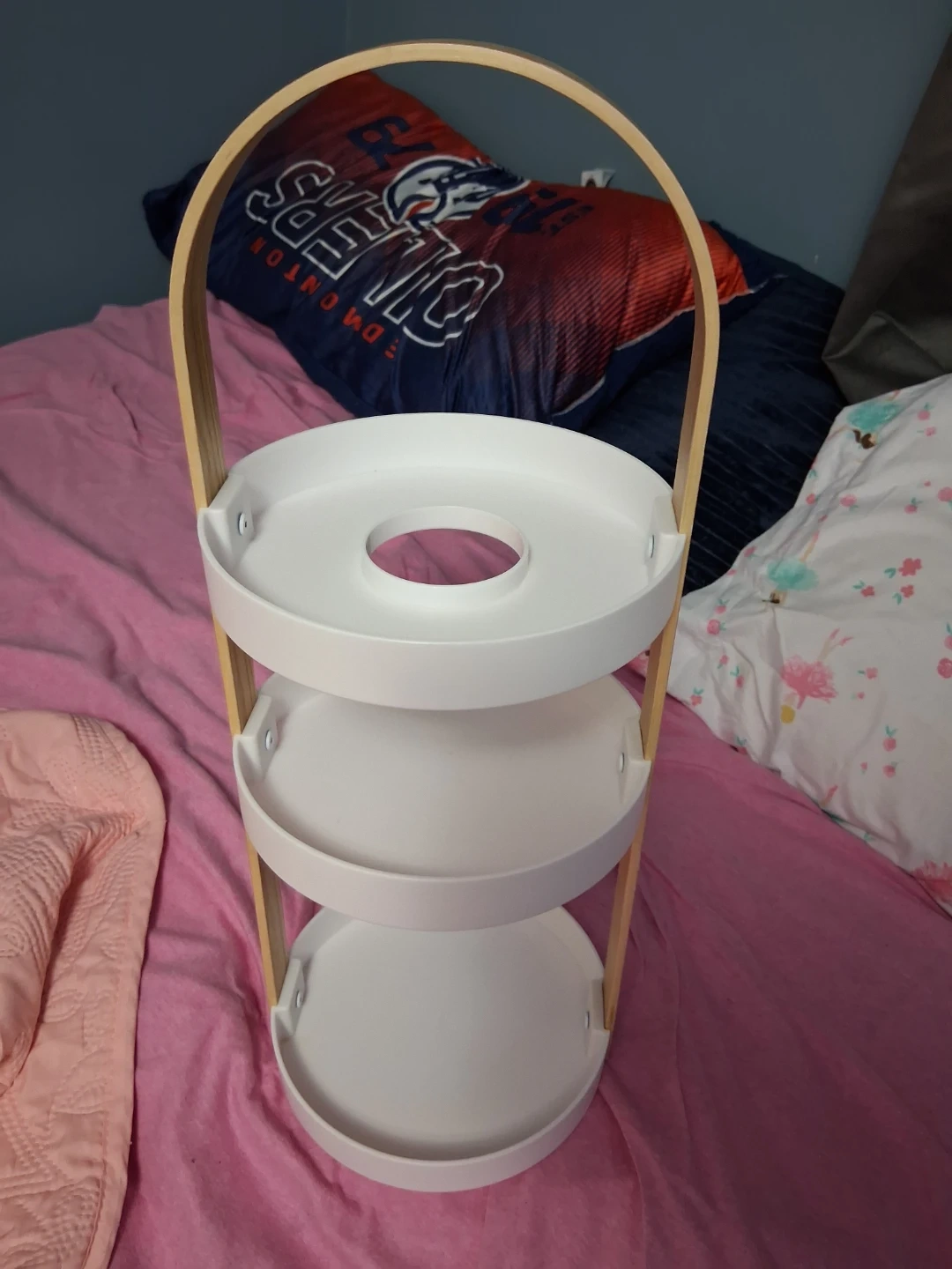 This 3-tier serving stand is perfect for displaying snacks or small items. It's made of white plastic tiers with a natural wood handle for easy carrying. The stand measures approximately 15 inches tall.