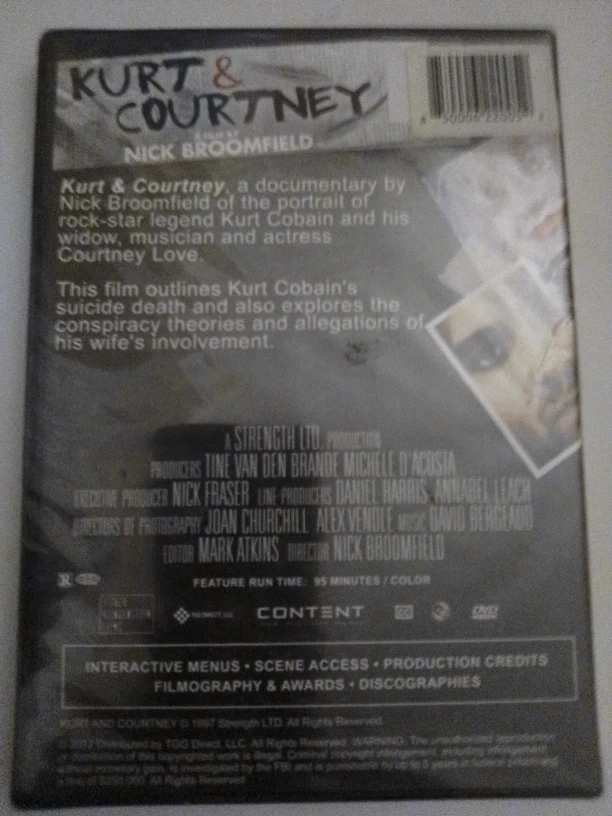 Selling the documentary DVD 'Kurt & Courtney' by Nick Broomfield. It explores the lives of Kurt Cobain and Courtney Love, delving into conspiracy theories surrounding Kurt's death. The DVD includes interactive menus, scene access, production credits, filmography & awards, and discographies. A must-have for fans!