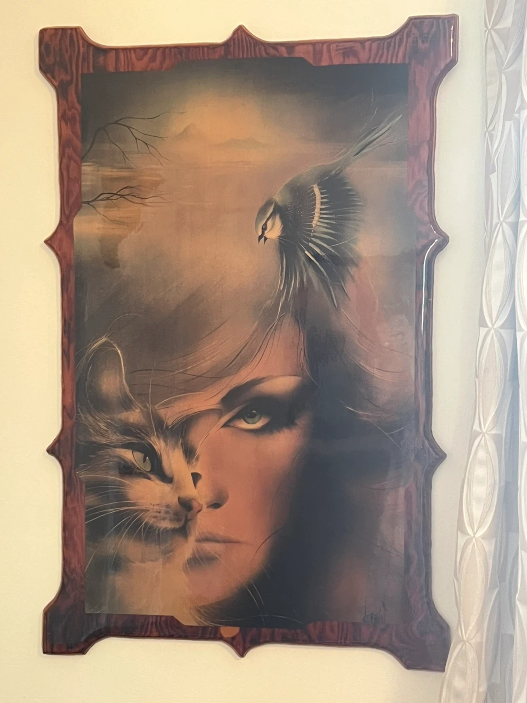 This striking framed print features a surreal design with a cat's face merging into a woman's, alongside a flying bird. The artwork is housed in a decorative, dark wood-effect frame with unique cutouts. It adds a touch of mystique to any wall decor.