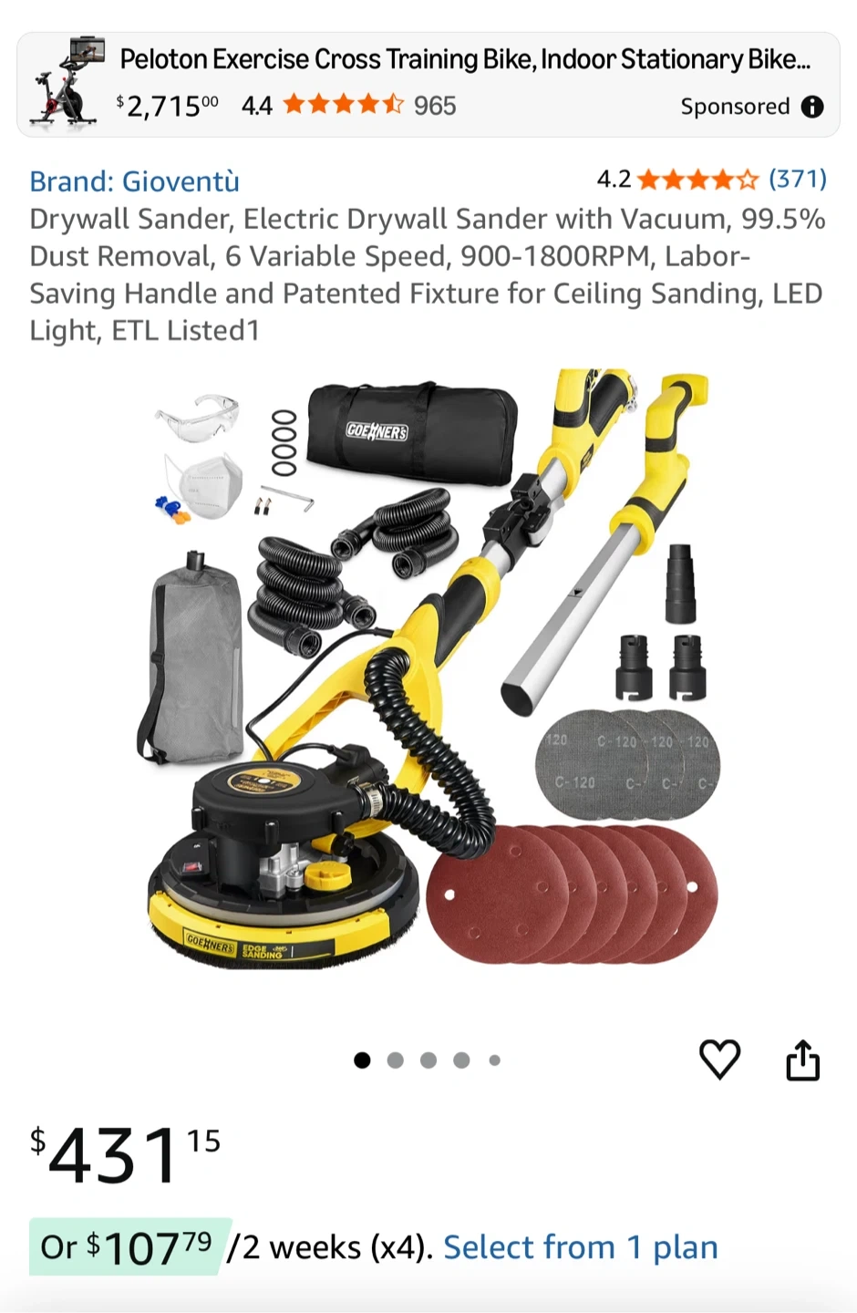 Selling a Goerner's drywall sander. It's a 6.5-amp powerful electric drywall sander with vacuum. It features 99.5% dust removal, 6 variable speeds from 900-1800RPM, a labour-saving handle, and a patented fixture for ceiling sanding with an LED light. The retail price for these is $500 after taxes and shipping. It comes with a box.