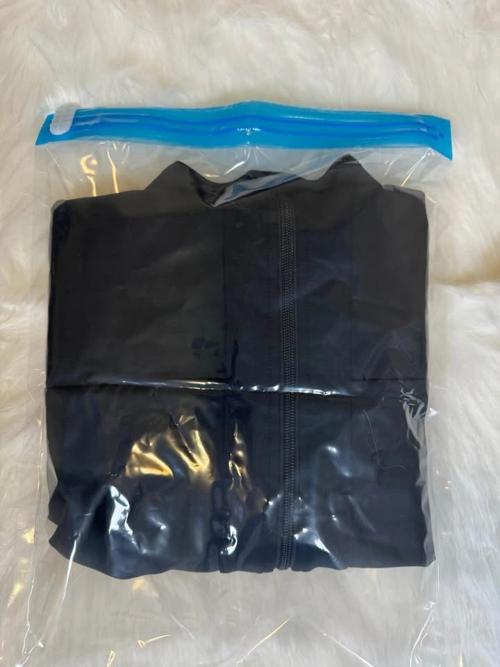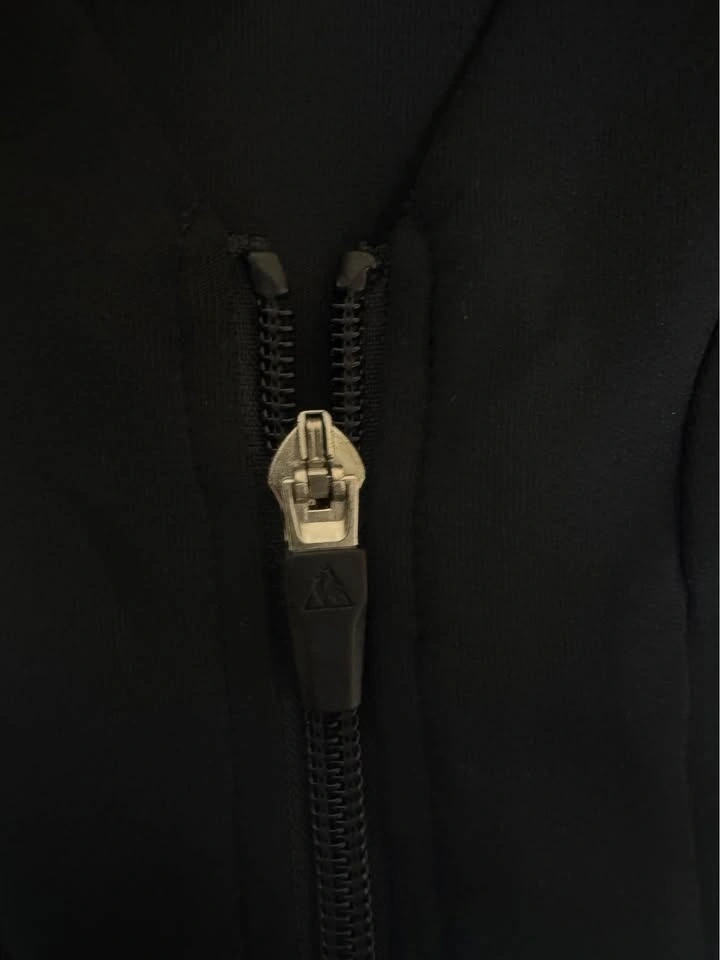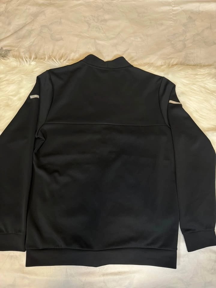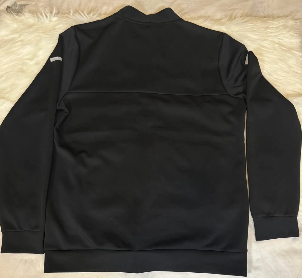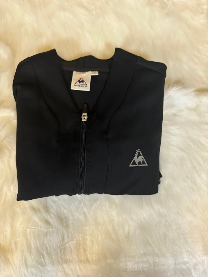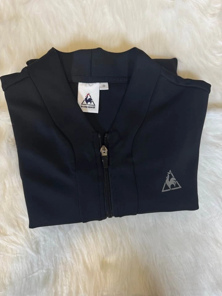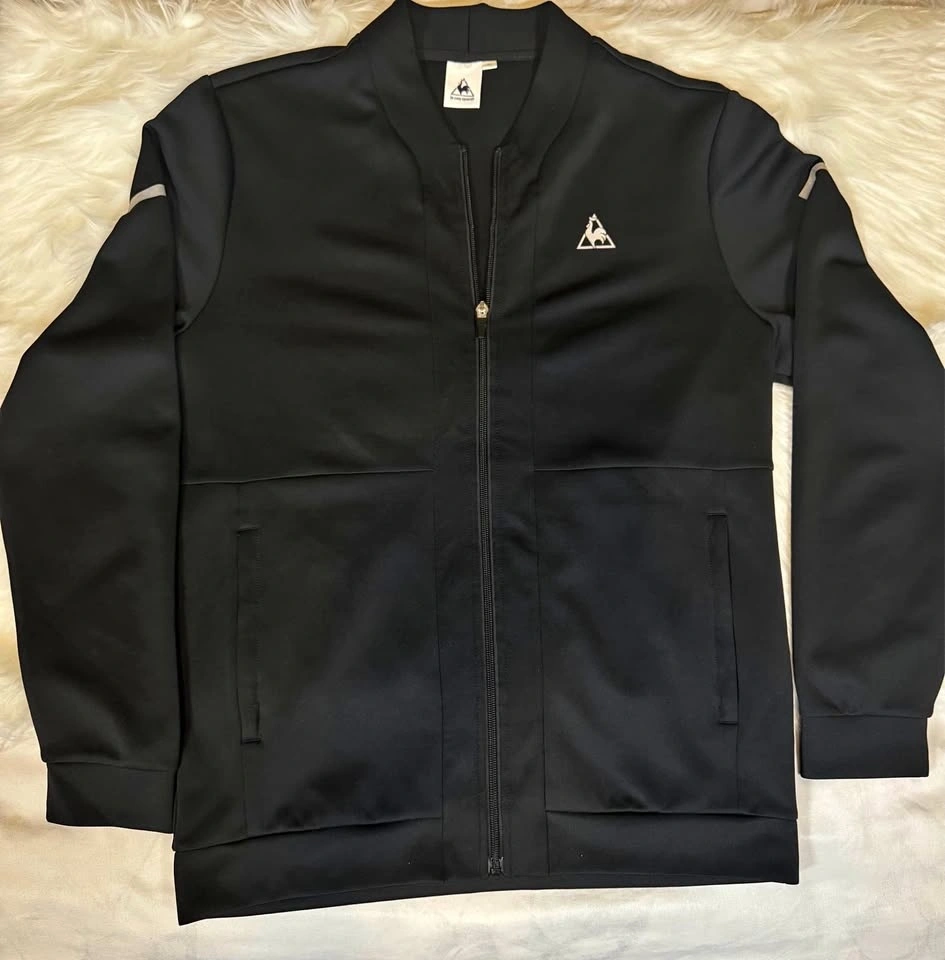 Sporty Le Coq Sportif black full-zip jacket with an embroidered logo on the chest and reflective details on the sleeves. Features two side pockets, great for everyday wear or a light workout. Almost new condition.
