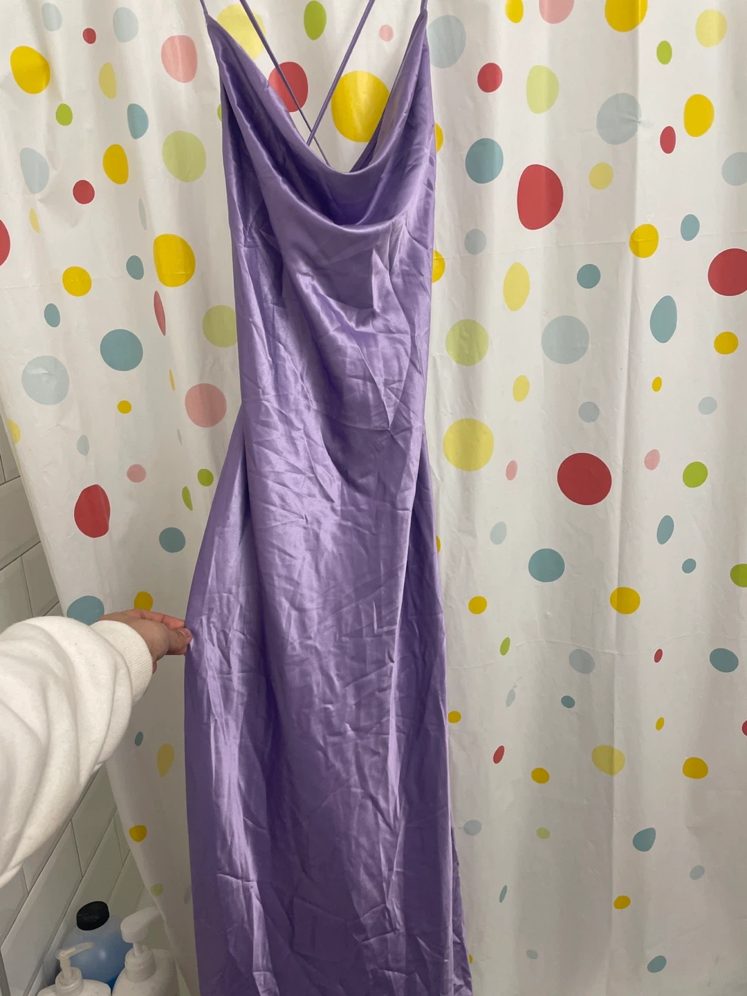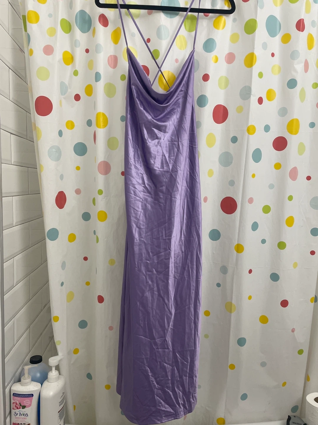 This is a beautiful purple satin maxi dress. It features thin spaghetti straps and a cowl neck. The fabric drapes nicely and it has a flowing silhouette.
