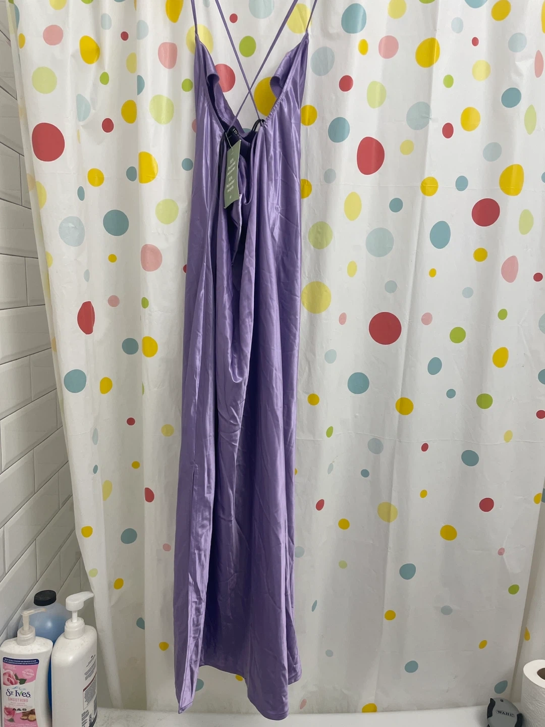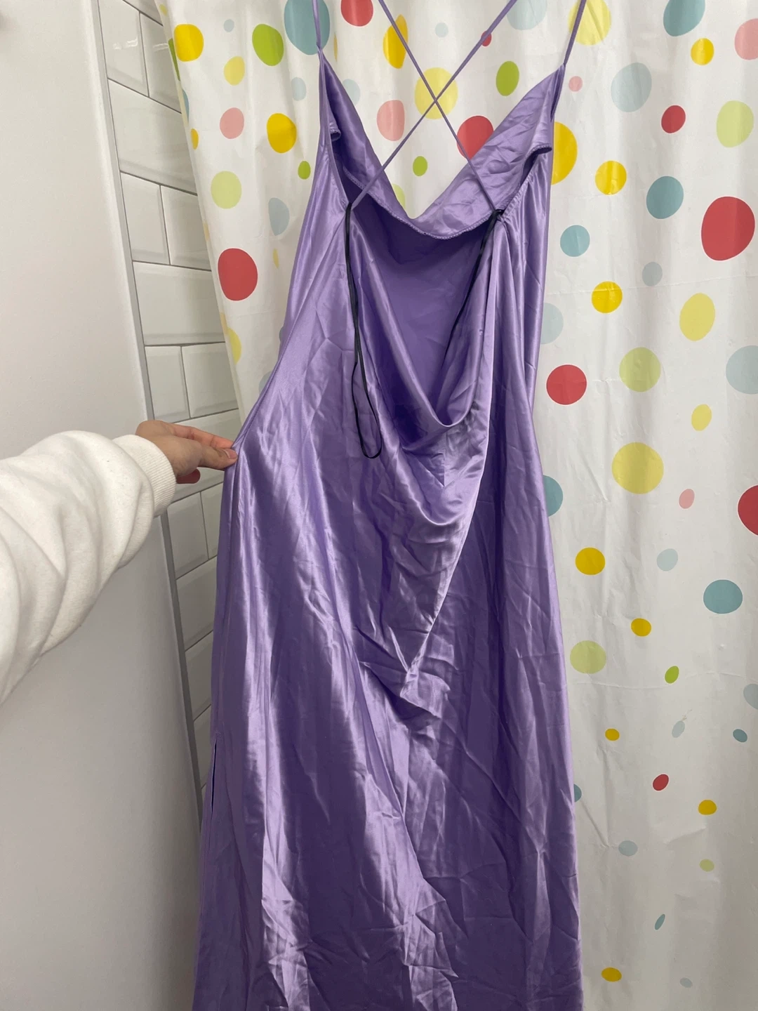 This is a beautiful purple satin maxi dress. It features thin spaghetti straps and a cowl neck. The fabric drapes nicely and it has a flowing silhouette.