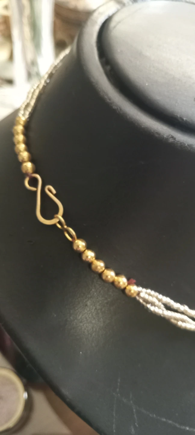 Three-strand beaded necklace featuring gold, red, and blue accents. It has a hook-and-loop clasp closure. This unique piece adds a pop of colour to any outfit! Designs like this are commonly handmade in regions such as India , Tibit or Nepel.
