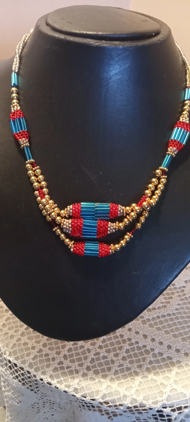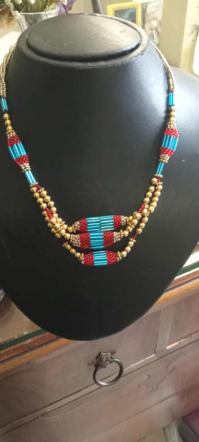 Three-strand beaded necklace featuring gold, red, and blue accents. It has a hook-and-loop clasp closure. This unique piece adds a pop of colour to any outfit! Designs like this are commonly handmade in regions such as India , Tibit or Nepel.