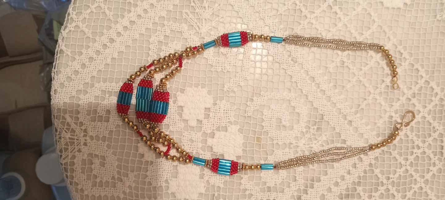 Handmade Beaded Necklace - Red, Gold, and Blue