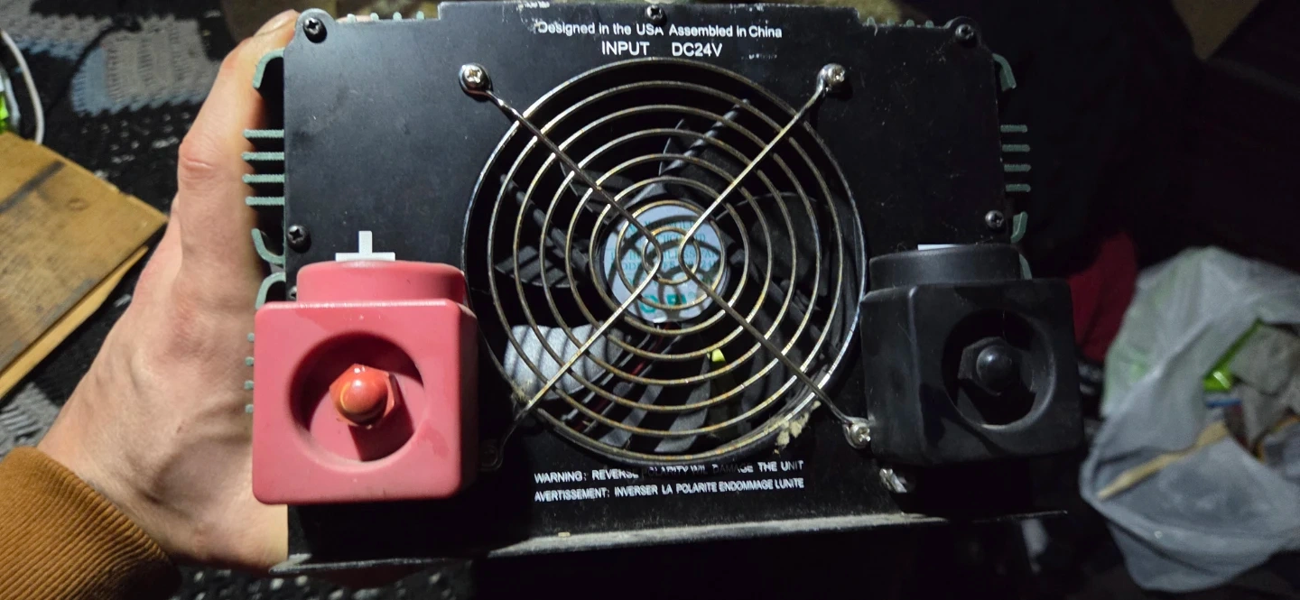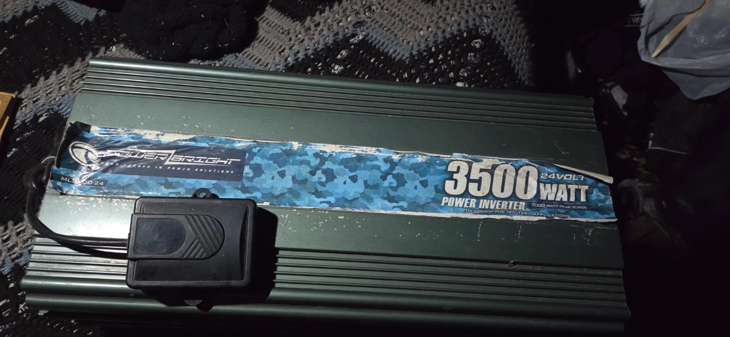This Power Bright power inverter is 3500 watts and operates on 24 volts. It has four AC outlets for outputting 110-120 volts. It's designed for heavy-duty applications.